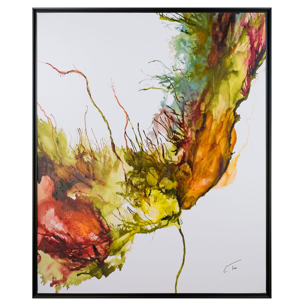 [0] => Beaded Arrow, by L. Tuza, is an abstract wall art depicting a stream of earthy colors curving and reaching out tendril-like lines over a white background. Shades of olive green, mustard yellow, rust brown, and burgundy mingle in a free-flowing manner, and a black frame makes this artwork ready to display.