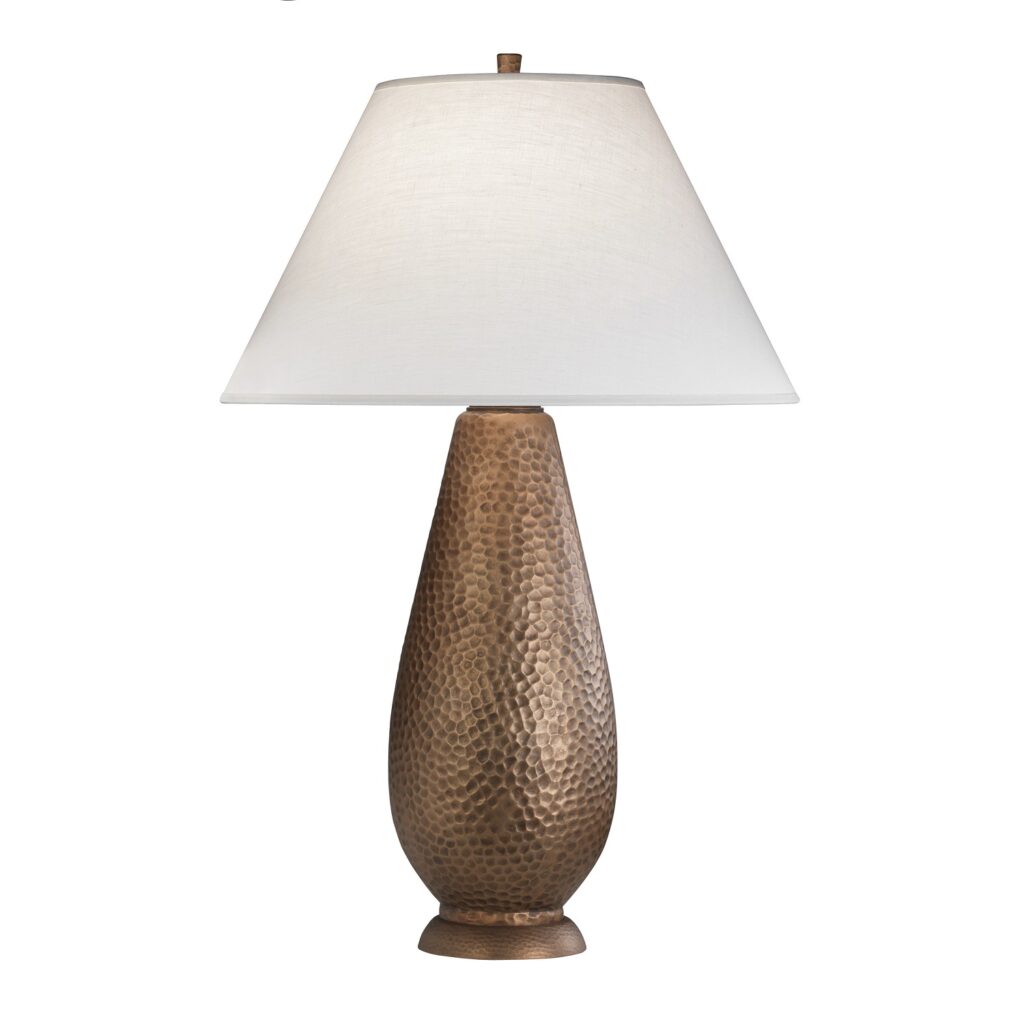 The Beaux Arts Table Lamp features a dark antique copper finish over hammered cast metal and an oyster linen shade. Classic and timeless, this piece has a distinct metal pattern that adds a hint of texture. The lamp has a 3-way switch and takes one 150W bulb (max), type A.