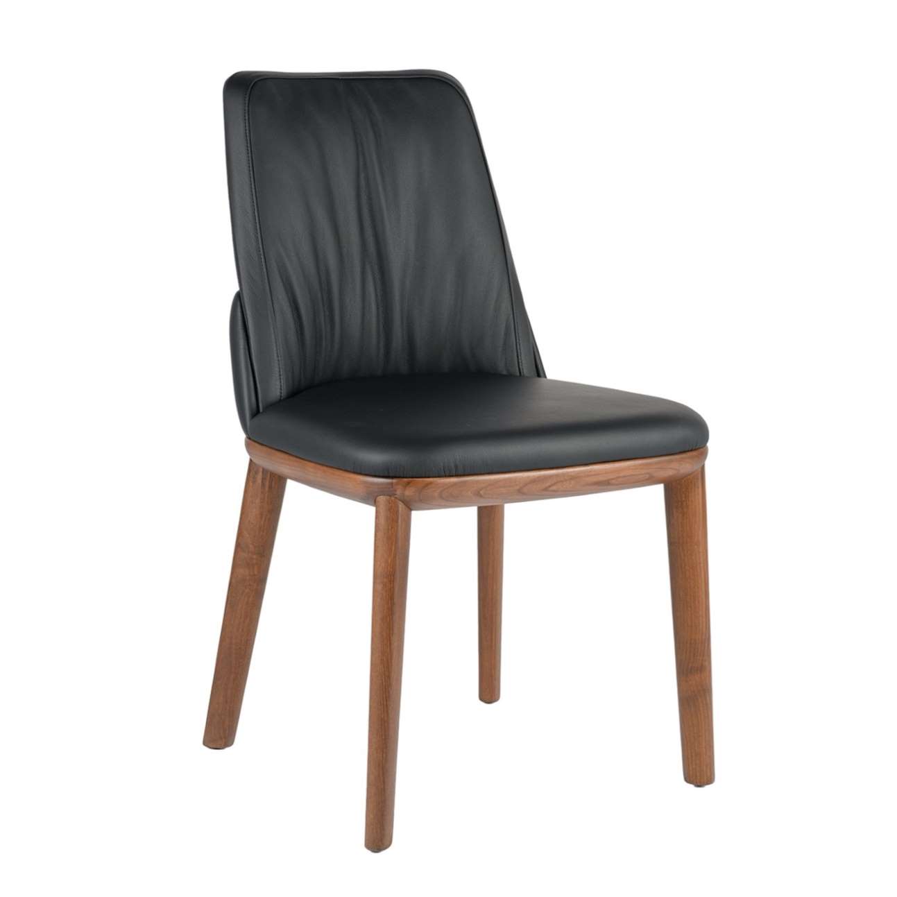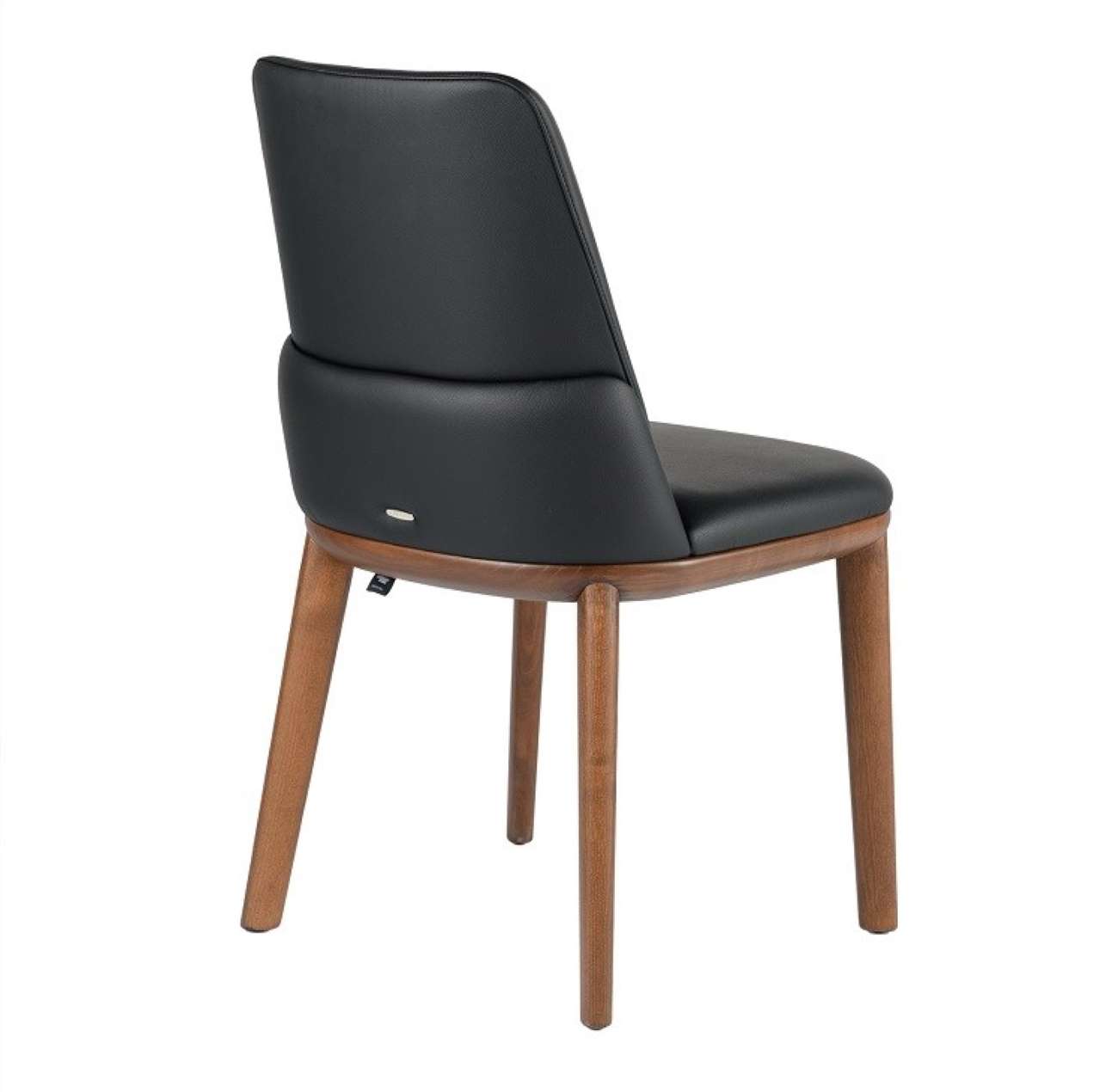 [0] => The Belinda Side Chair, designed by Paolo Cattelan, blends high quality materials with luxurious, elegant design. Belinda has a tapered backrest with ample cushioning, plus a cushioned accent on its outer back side that enhances its comfortable look. The back and seat are upholstered in black leather, while the ash frame with rounded legs and a Canaletto walnut finish adds a warm wood hue.