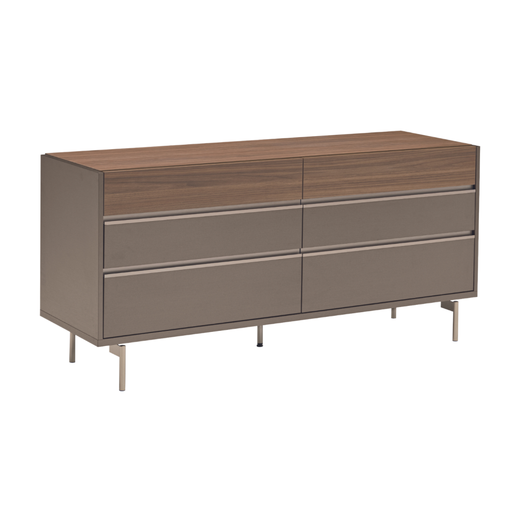 Understated and elegant, the Bella Borgata Dresser will refresh your space with its light, airy design, earthy tones, and modern accents. Made in Italy, the dresser has a tabletop and two upper drawers finished in warm, eco-veneer walnut, with sides and lower drawers in smooth matte bronze. The drawers are soft close and have integrated pulls for easy access to your nighttime essentials, plus an interior in textured dark grey wood. Slim bronze metal legs add a burnished metal accent and modern look. Cozy, woodsy, and warm, the Bella Borgata bedroom collection invites you to embrace true relaxation.