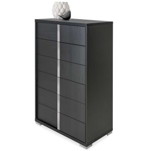 The Bella Centro High Chest features sleek, clean lines and a classic design. The glossy grey silverwood base is accented by matte black handles and legs, adding a sophisticated, cool-toned look. Five drawers provide ample storage space for your clothes and accessories, while the elegant frame brings timeless style into your bedroom.
