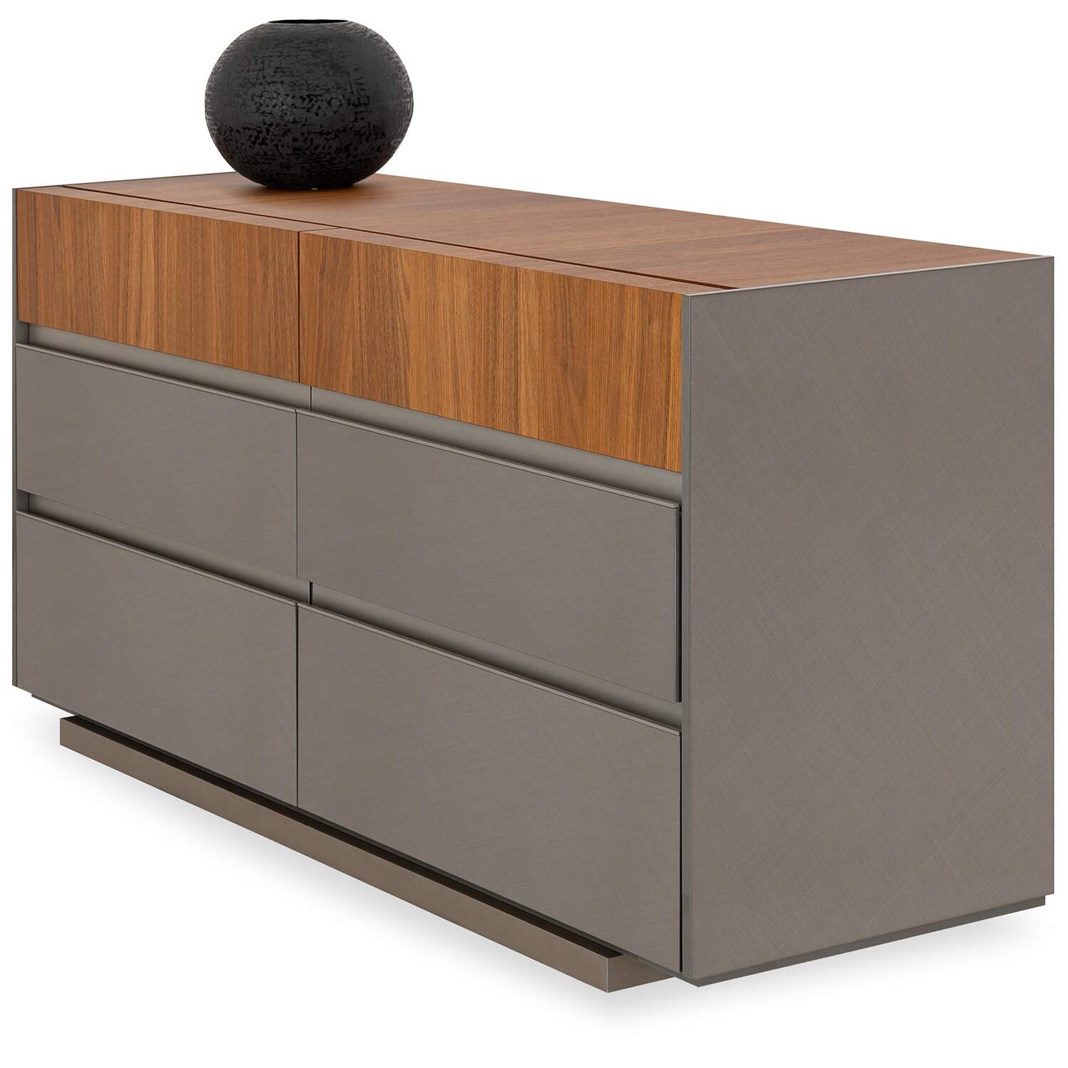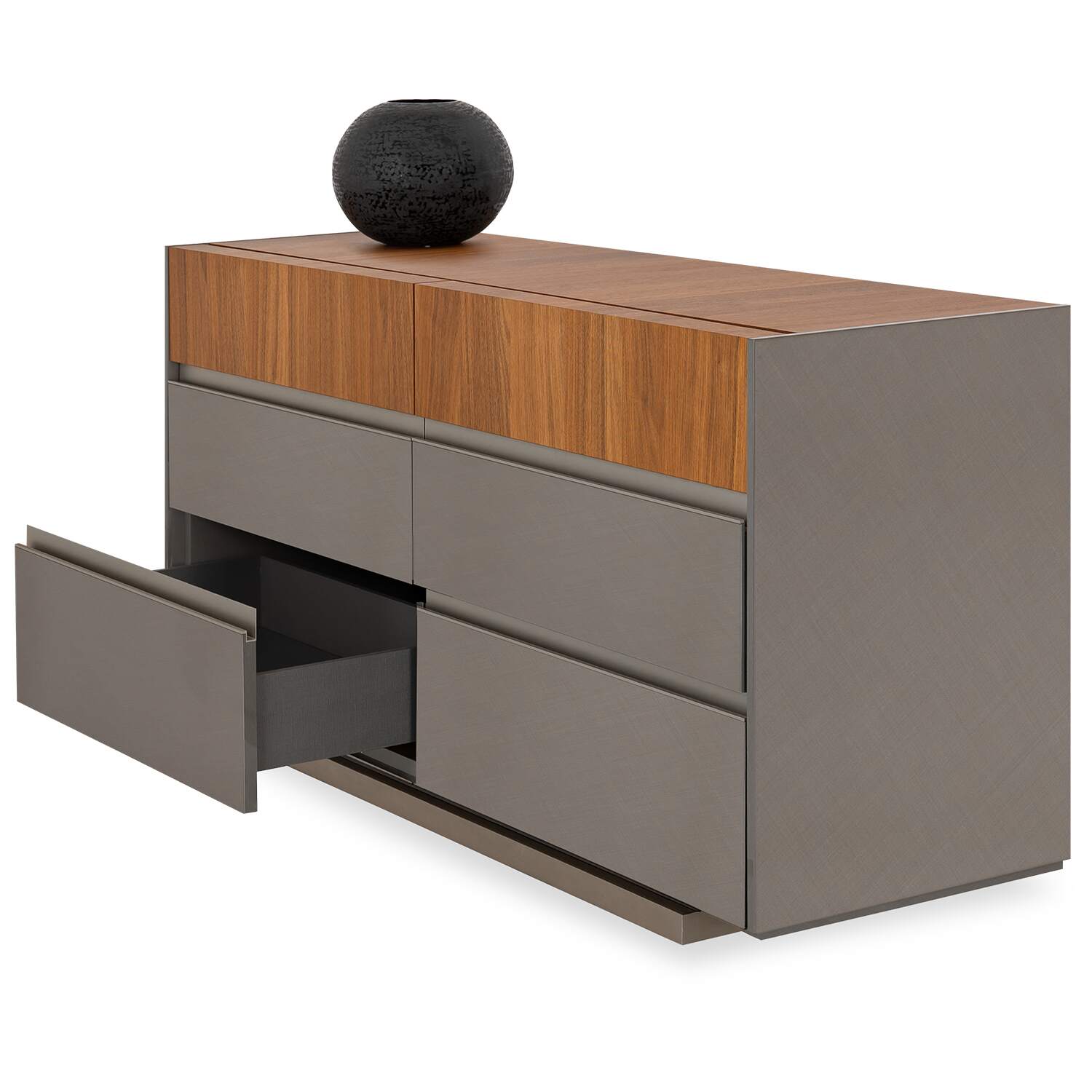 Dress your best and stay organized with the Bella Clara Dresser, designed in Italy. Bella Clara has a top surface and uppermost drawers of walnut wood laser-cut with a rippled effect, plus sides and lower drawers that sport a grey high-gloss lacquer with a subtle cross-hatched pattern. Smaller in size, the two highest drawers have angled top cutouts and are ideal for storing lighter clothes and accessories, while the larger drawers below have plenty of room for more substantial clothing. Soft-close mechanisms on each drawer prevent damage, while the brushed brass base and accent panels add contemporary style.