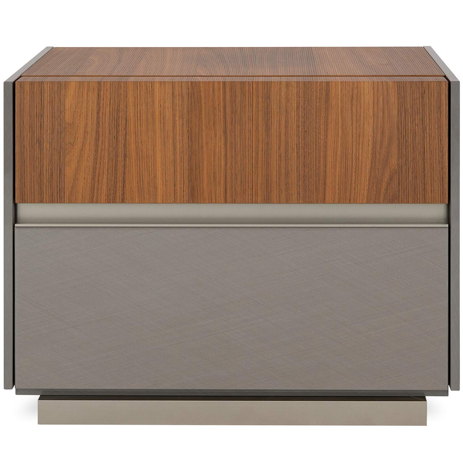 Keep your bedroom necessities close at hand with the Bella Clara Nightstand, designed in Italy. Bella Clara has a top surface and upper drawer of walnut wood laser-cut with a rippled effect, plus sides and lower drawers that sport a grey high-gloss lacquer with a subtle cross-hatched pattern. Smaller in size, the first drawer features an angled top cutout, while the larger second drawer has room for more substantial items. Soft-close mechanisms on each drawer prevent damage, while the brushed brass base and accent panel add contemporary style.