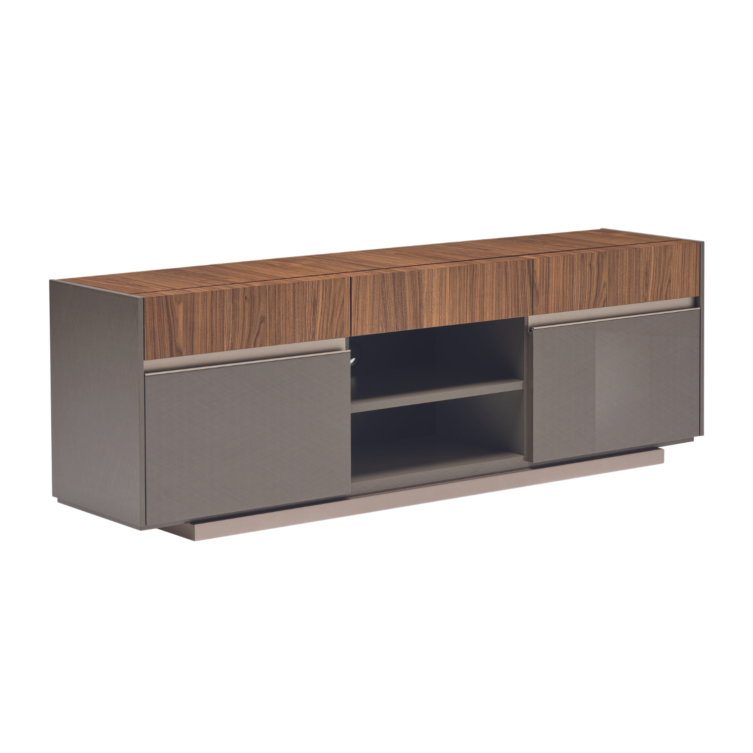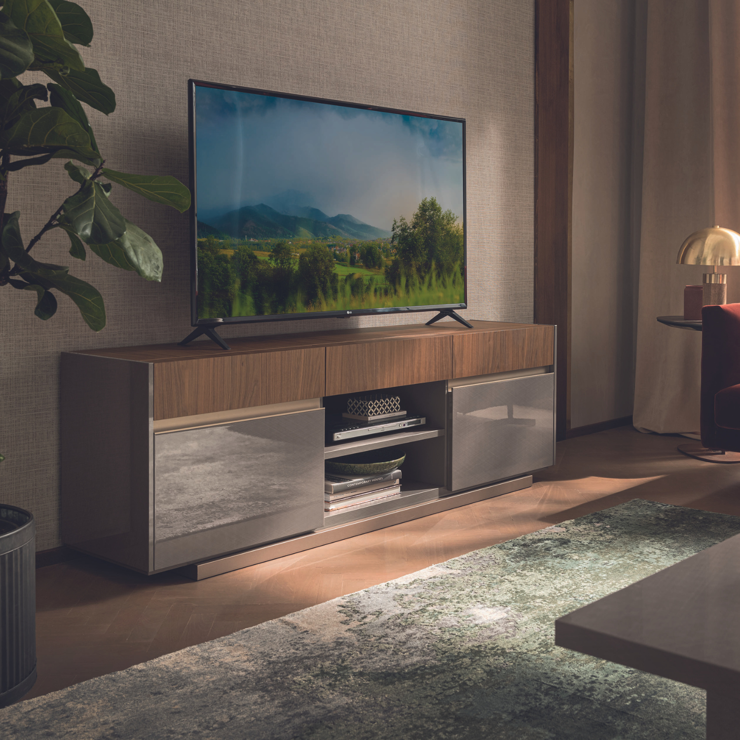 [0] => Store all you need for movie nights, gaming sessions, and TV binges with the Bella Clara TV Base, designed in Italy. This base features a top and three drawers of walnut wood laser-cut with a rippled effect, plus sides and lower doors that sport a grey high-gloss lacquer with a subtle cross-hatched pattern. The drawers have angled top cutouts and are ideal for storing remotes, headphones, and other accessories, while the two cabinets and two open shelves have plenty of room for your favorite DVDs and games. Soft-close mechanisms on doors and drawers prevent damage, while the brushed brass finish on the base, open shelves, and accent panels add contemporary style.