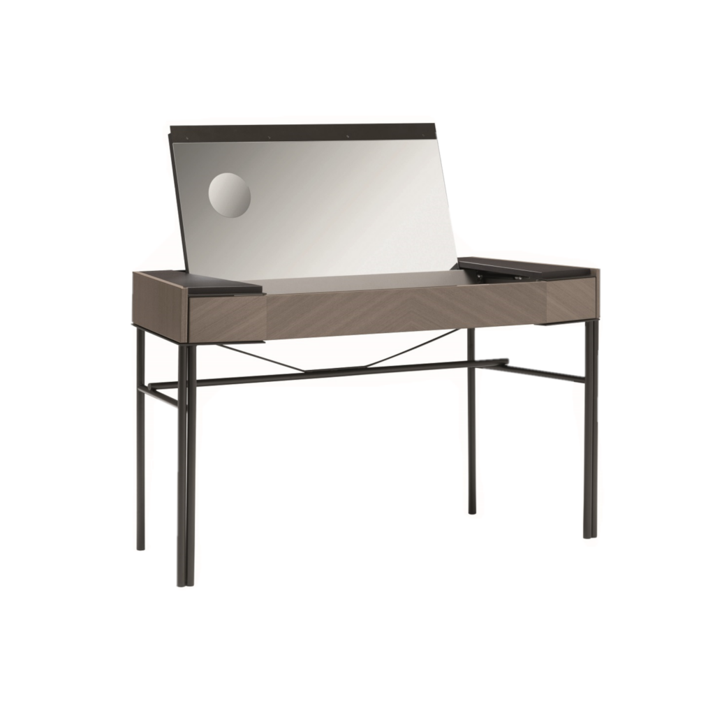 [0] => The Bella Eleganza Vanity is the perfect companion to any modern bedroom and a representation of simple elegance. This refined and uncluttered design features a high-gloss eukalipto wood body with a tabletop of matte mahogany veneer. The center of the tabletop lifts to reveal roomy inner storage. When placed in your closet, bedroom, or dressing space, the vanity can store jewelry, perfumes, and more.