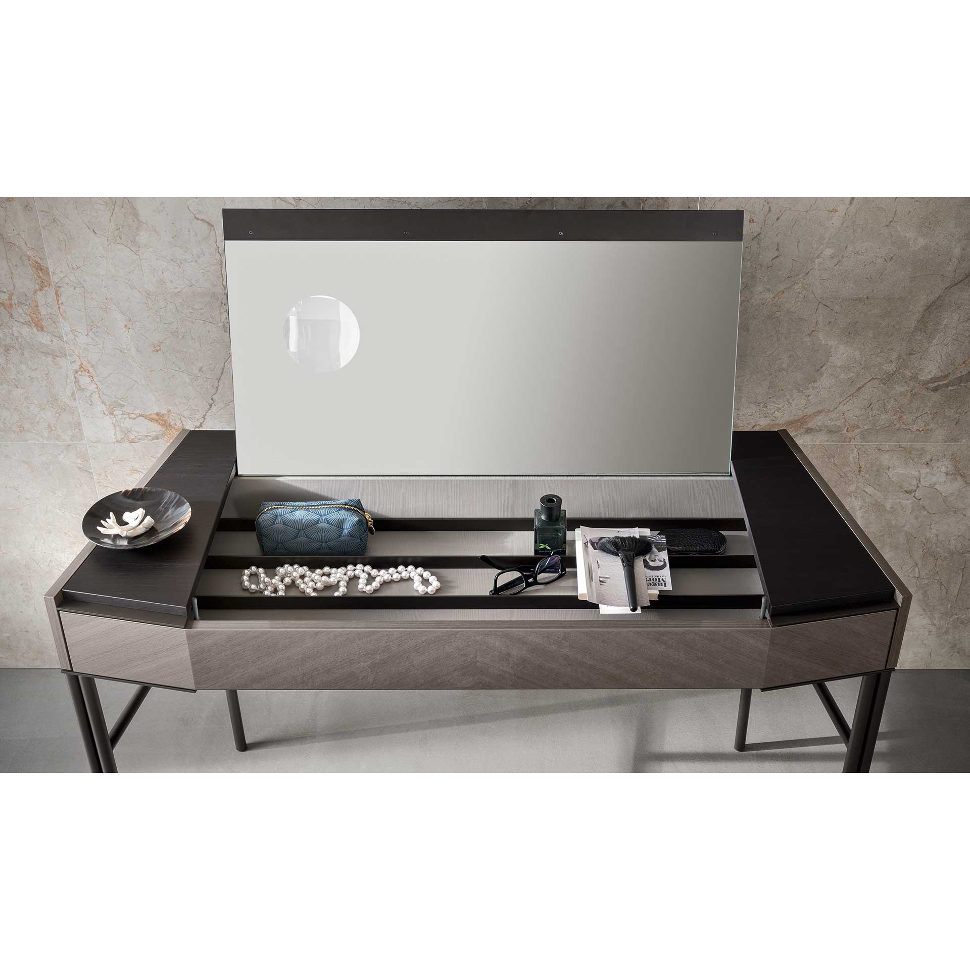 The Bella Eleganza Vanity is the perfect companion to any modern bedroom and a representation of simple elegance. This refined and uncluttered design features a high-gloss eukalipto wood body with a tabletop of matte mahogany veneer. The center of the tabletop lifts to reveal roomy inner storage. When placed in your closet, bedroom, or dressing space, the vanity can store jewelry, perfumes, and more.