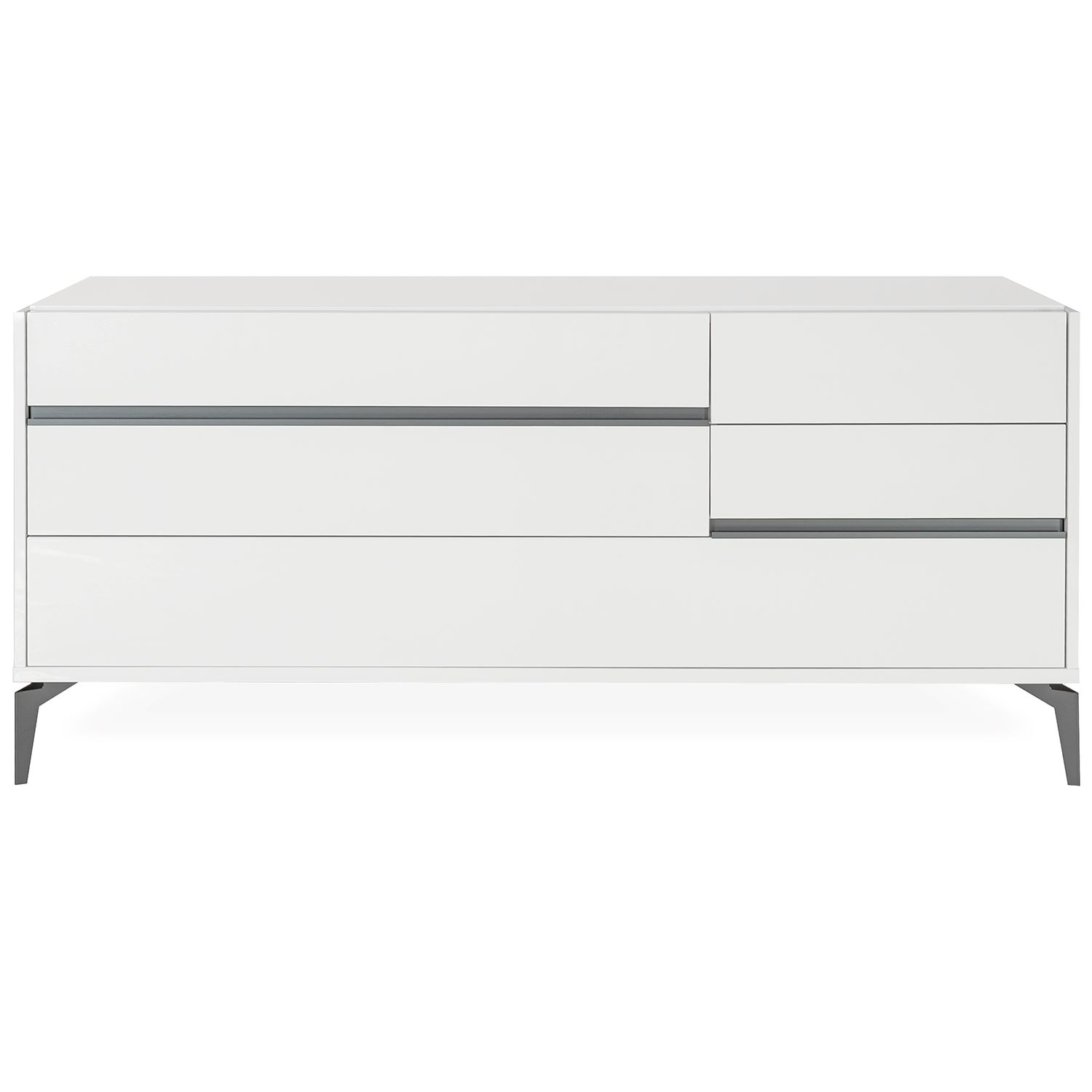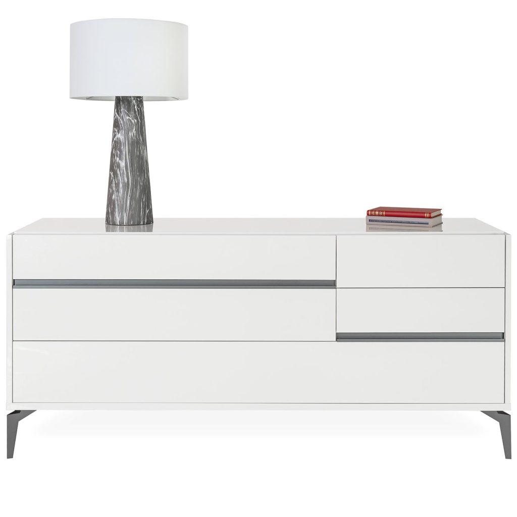 Elegant and versatile, the Bella Farfalla Dresser features light wood veneer with a glossy white lacquer finish. Metallic grey accents add a cool-toned touch, while five spacious, asymmetrical drawers provide ample storage space. Pair with the rest of the Bella Farfalla bedroom collection to create a fully contemporary bedroom space.