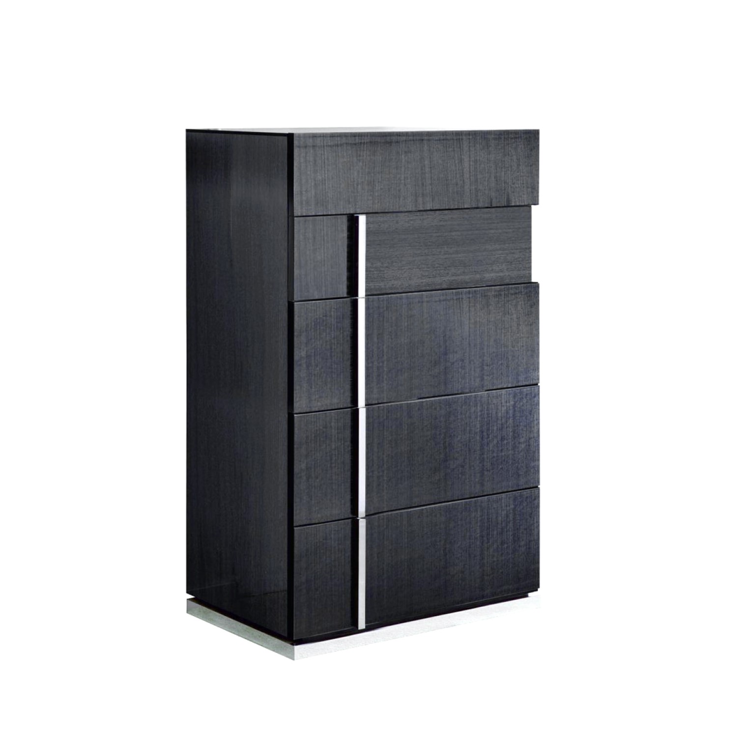 The Bella Grigio chest, made in Italy, is a stunning contemporary high chest in dark grey high gloss koto wood. This chest has five spacious drawers and an eye-catching metal accent placed elegantly along its side.
