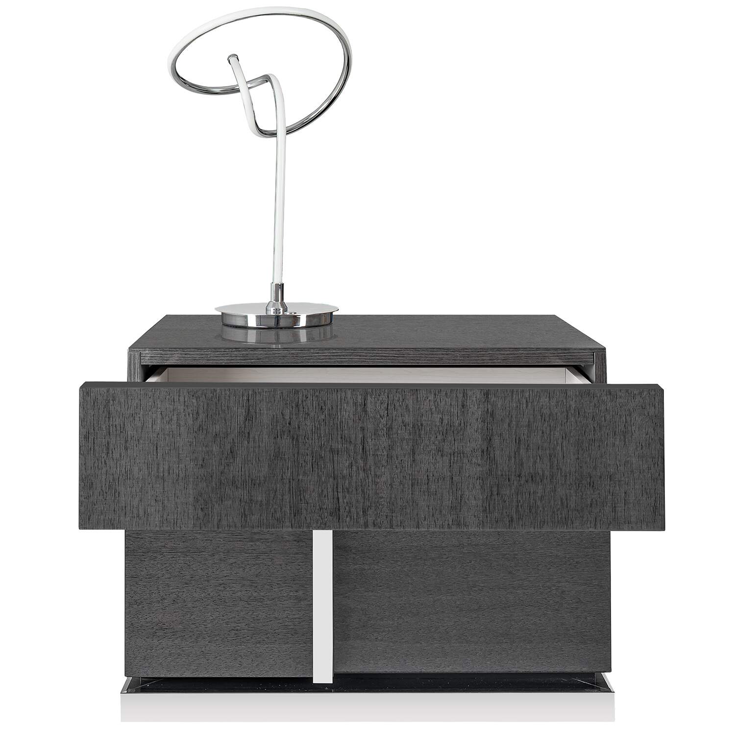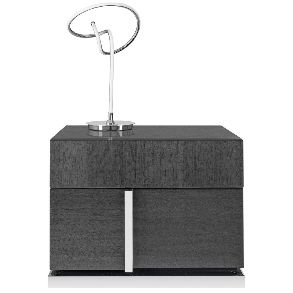 The Bella Grigio nightstand, made in Italy, is a stunning contemporary nightstand in high gloss grey koto wood. The nightstand has two spacious drawers and an eye-catching metal accent placed elegantly on the side. The Bella Grigio nightstand complements the Bella Grigio bed.