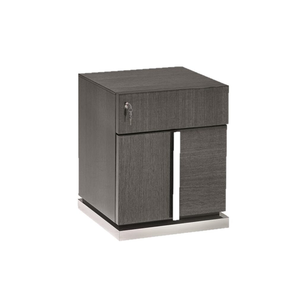 The Bella Grigio two drawer pedestal, made in Italy, is a beautiful contemporary pedestal with koto high gloss wood and a plinth with metal accents. The pedestal complements the Bella Grigio desk.