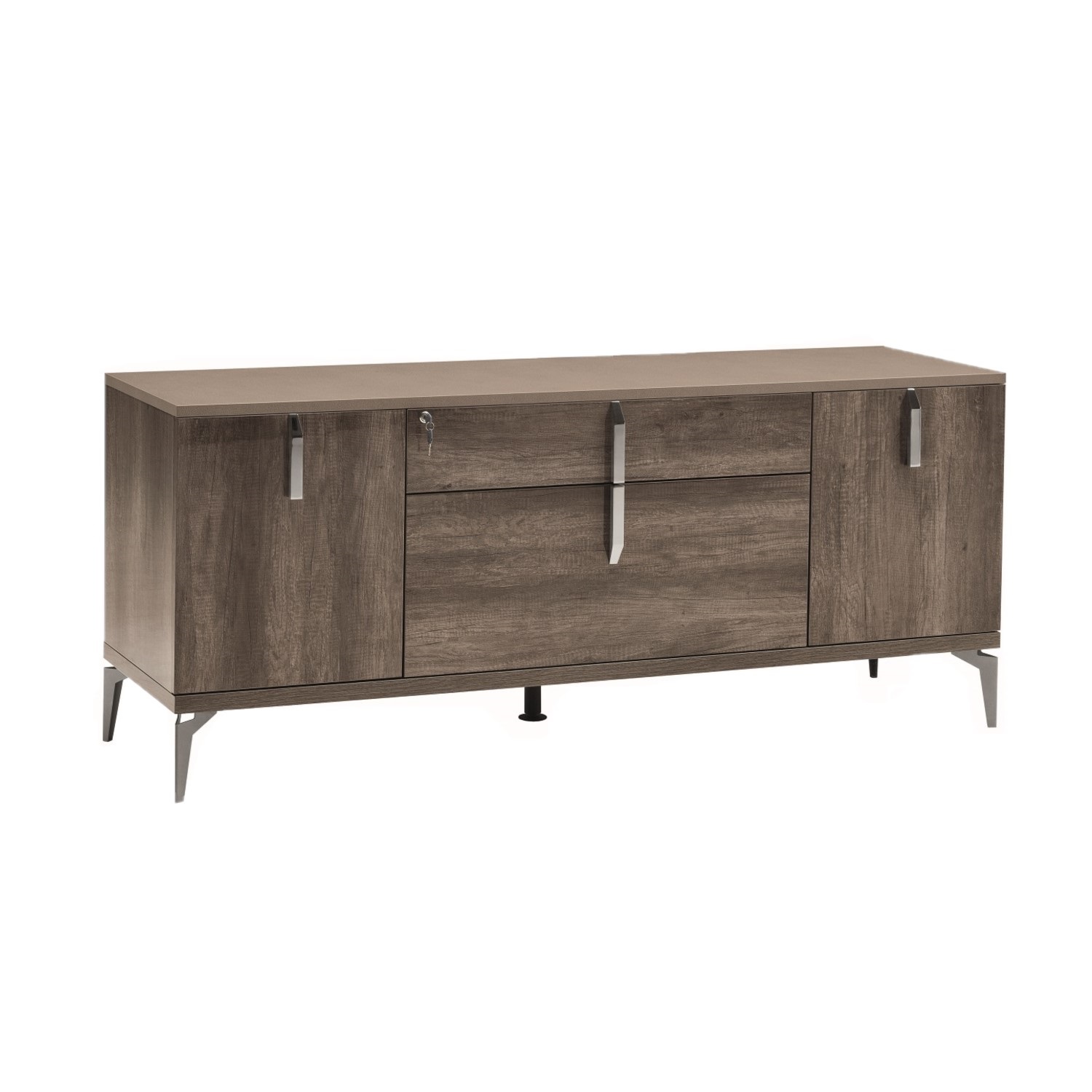 The Bella Nuova Credenza, available in rim oak with a firm grain surface, complements any of the Bella Nuova desks. With two cabinets and two spacious drawers, this credenza has ample storage space and includes a locking mechanism to keep your files secure.
