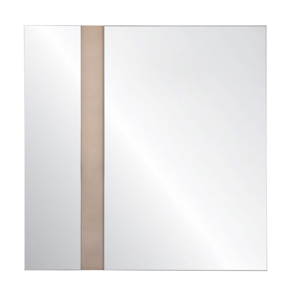 The Bella Nuova Mirror is sleek and stylish with an abstract, off-center design that adds a hint of intrigue. The mirror is strikingly "cut" with a beige grain surface showing through, one that matches the rest of the Bella Nuova bedroom set. A high-quality, functional design.
