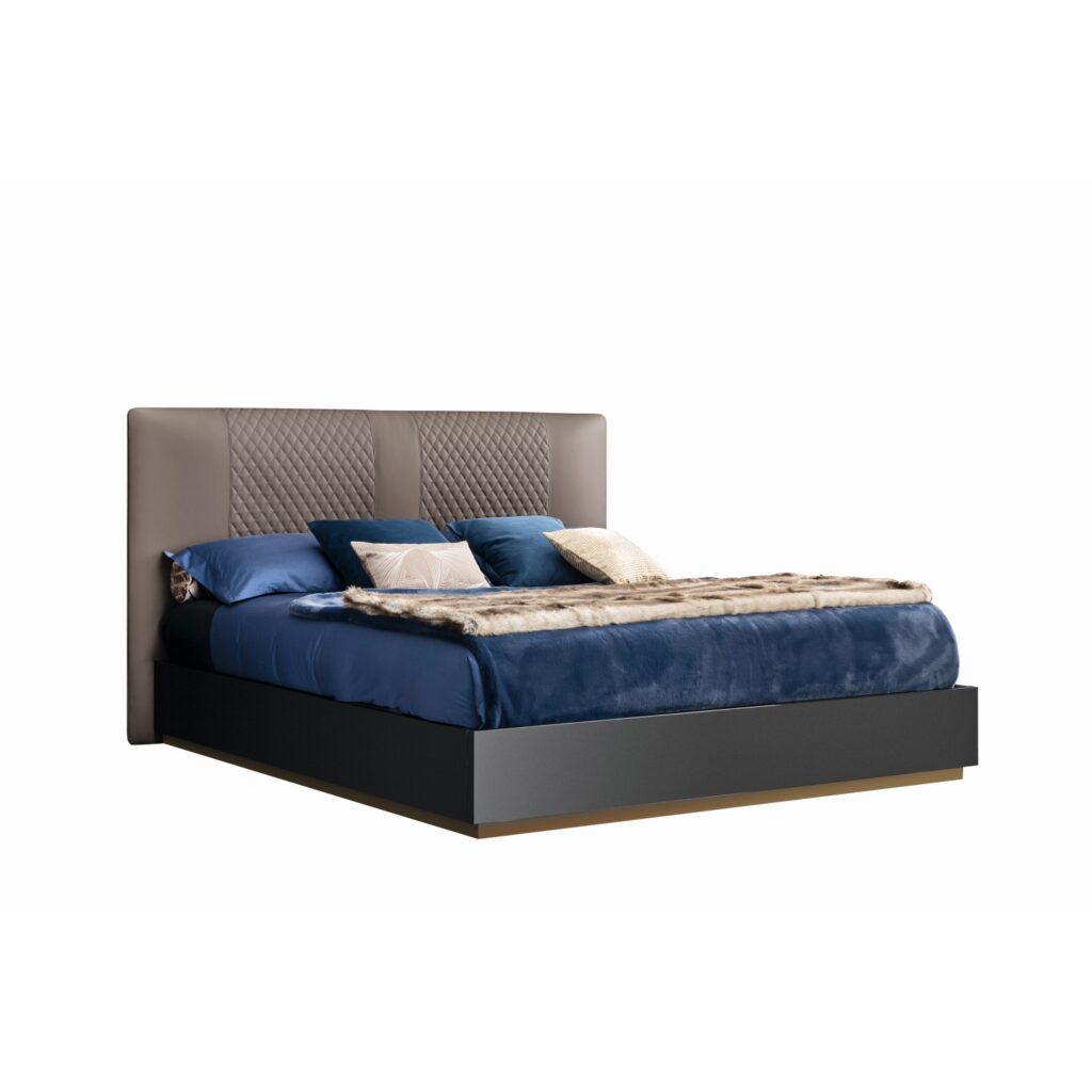 [0] => With an art-deco-inspired design, the Bella Onda King Bed is a true showstopper. The wide headboard is upholstered in taupe eco-leather with diamond quilting for a textured accent, and the dark grey melamine frame features a subtle brass highlight at the base. Eye-catching and functional, the Bella Onda King Bed perfectly complements the rest of the Bella Onda bedroom collection.
