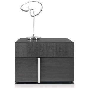 [0] => With its masterful blend of materials and textures, the Bella Ruggente Nightstand embodies the pinnacle of contemporary luxury, with nods to mid-century modern design. Bella Ruggente's drawer fronts immediately catch the eye with their walnut veneer carved in irregular vertical channels. Gold lacquer adorns the curved sides of the nightstand, and the top is finished in grey eco-stone with white veining for an opulent look. Two soft-close drawers keep your bedside essentials organized, while metal legs with a unique rounded shape add the finishing touch to this sumptuous, Italian-made nightstand.