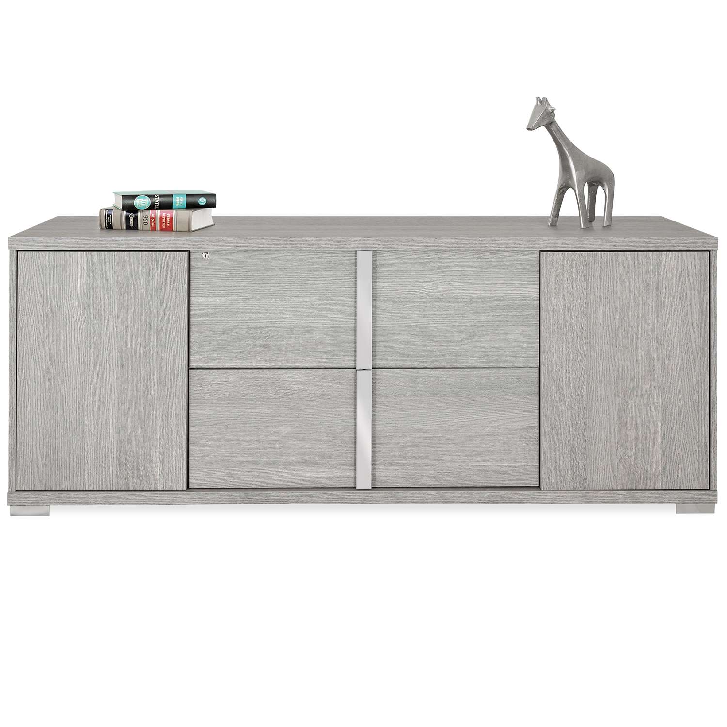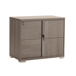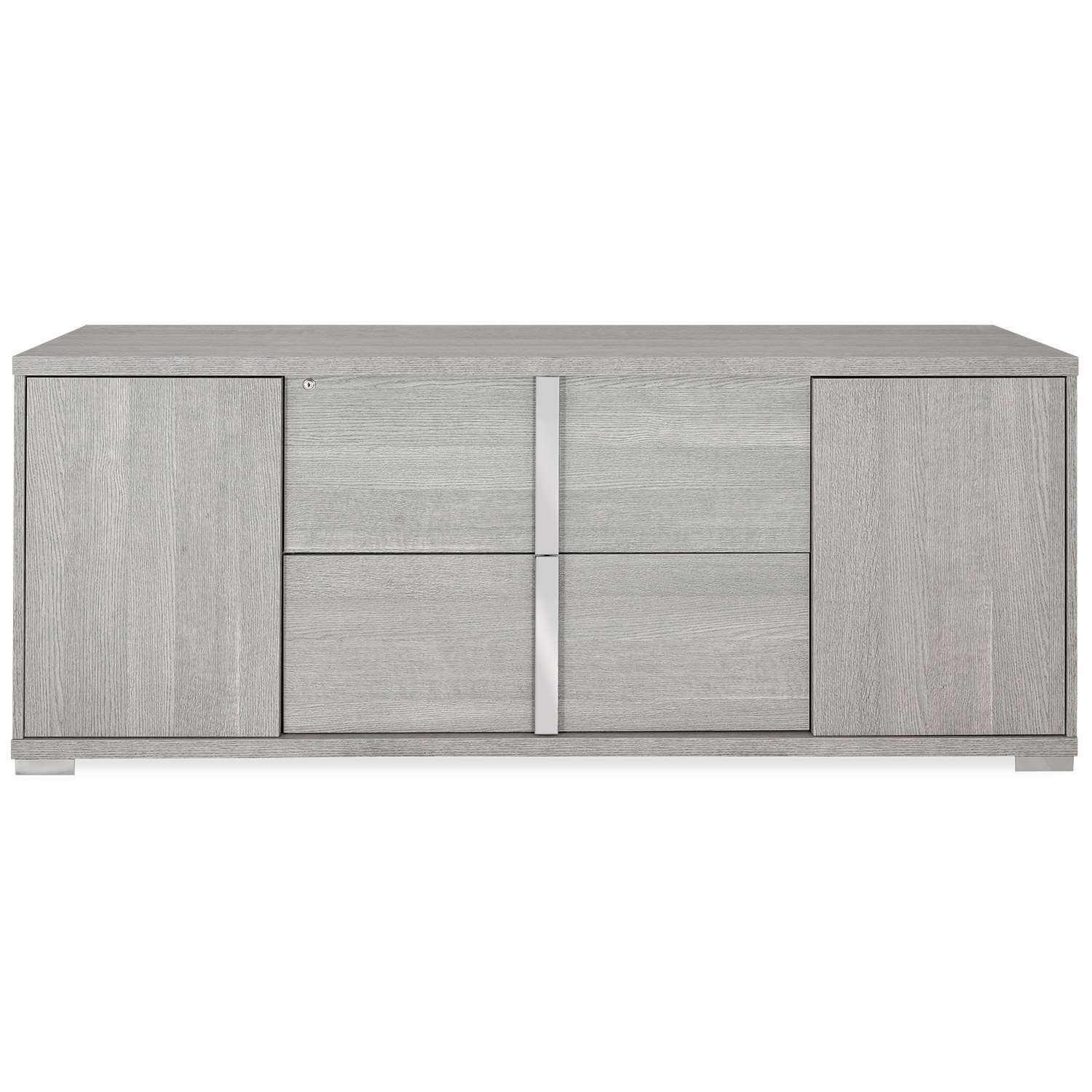 The Bellami Credenza 180, available in warm grey eco-veneer, features clean lines enhanced by contemporary chrome accents. With two cabinets and two file drawers, this credenza provides ample storage space for your files, valuables, and office necessities. Pair this credenza with other items in the Bellami collection to boost your productivity and comfort, whether you work from home or in an office.