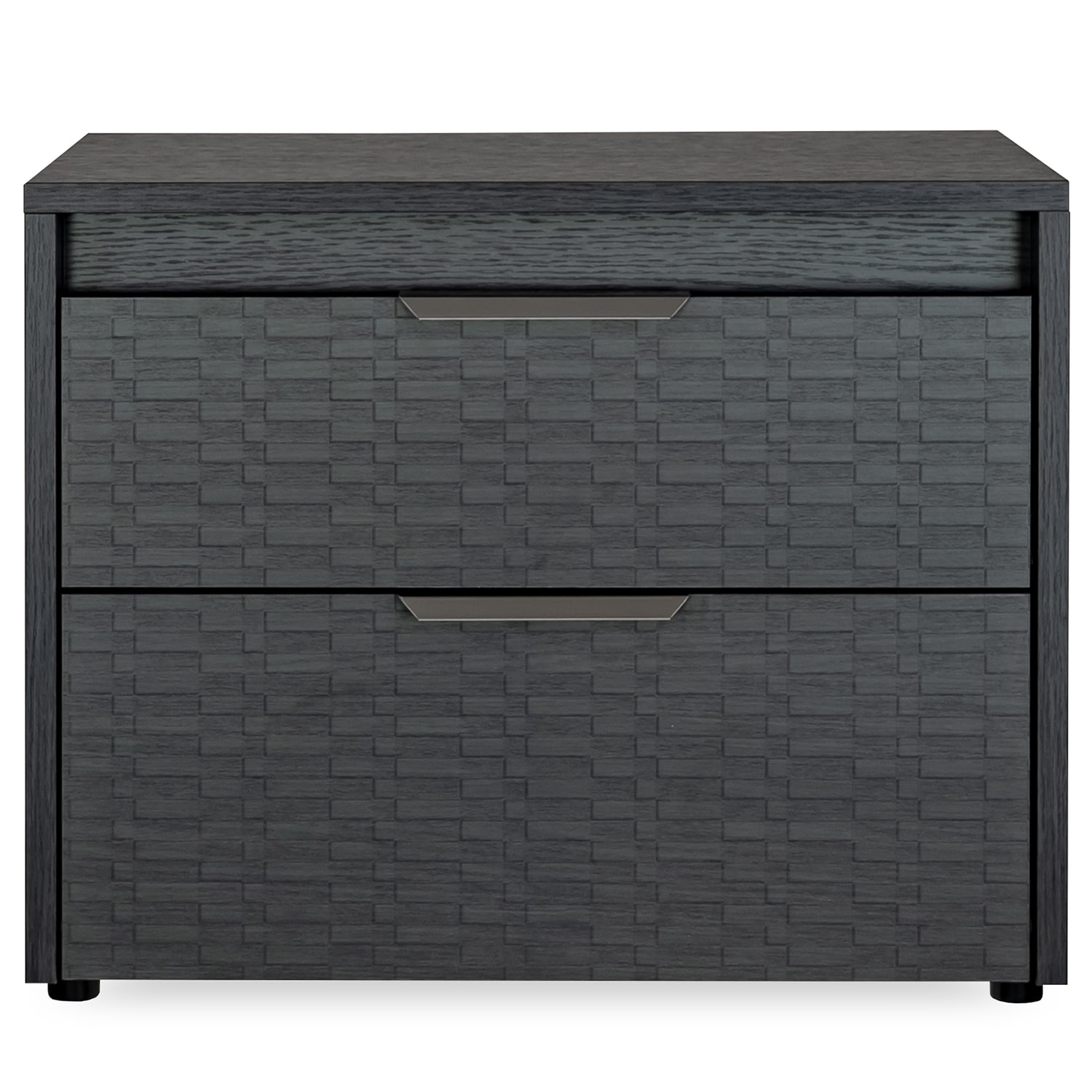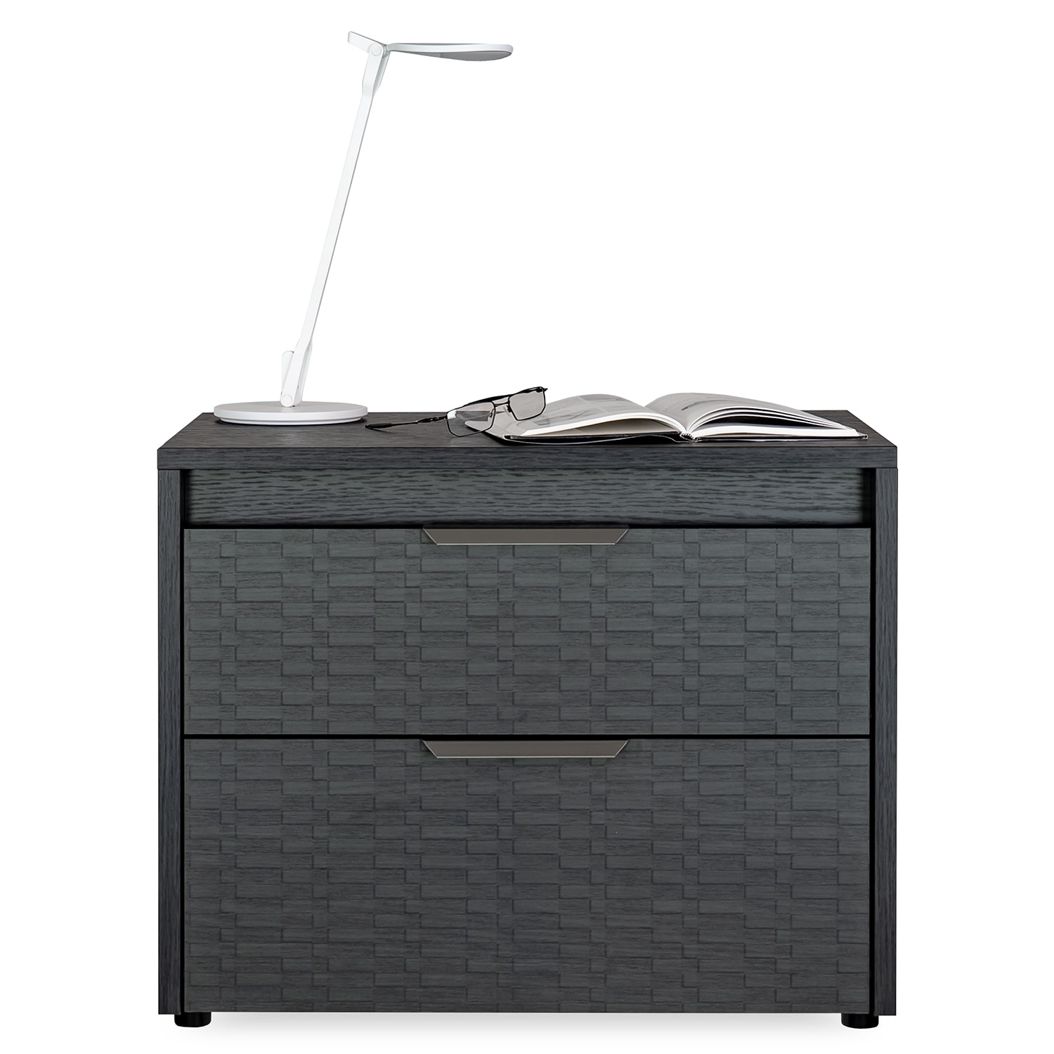 Made in Italy, the Bellezza Nightstand features distinctive Tetris-textured drawer fronts that accentuate its bold, variegated appearance, framed by a smooth eco dark oak finish. Two soft-close drawers offer practical bedside storage for books, devices, or everyday items. Built-in top-edge LED lighting casts a warm, ambient glow, adding a calming atmosphere ideal for winding down in a modern bedroom.