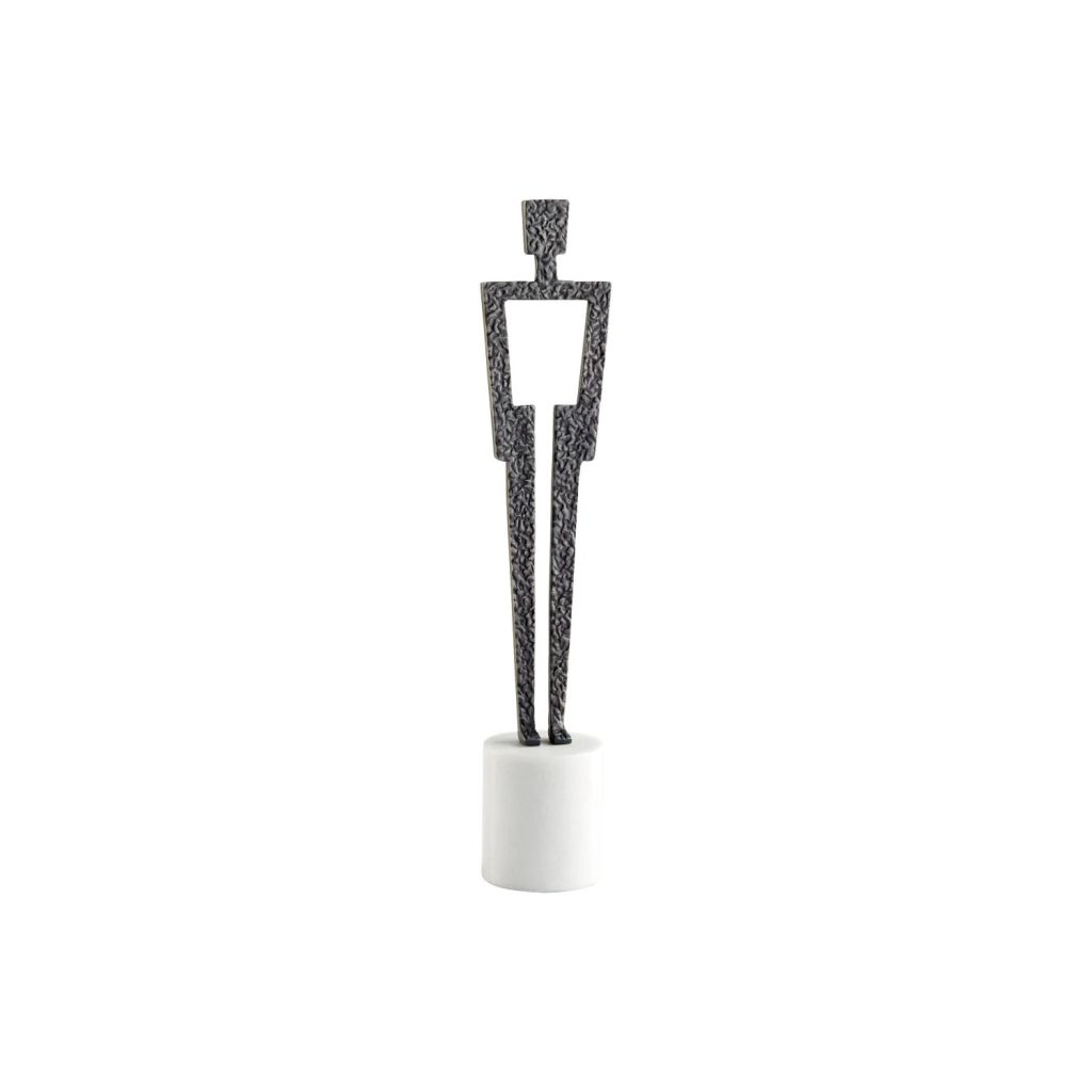 [0] => Designed by J. Kent Martin, the Benedict Sculpture forms a duo with the Beatrice Sculpture to pay homage to the iconic couple from Shakespeare's Much Ado About Nothing. This sculpture features a simplified male silhouette made of hand-hammered steel with an antique bronze finish. A cylindrical white marble base lets Benedict be displayed with ease on any flat surface.