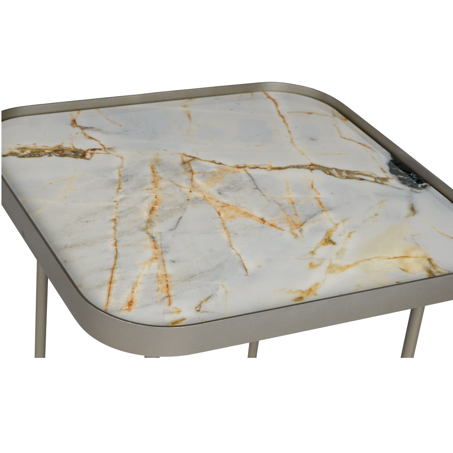 The Benny Keramik Small Side Table features a rounded square top made of white ceramic marble with golden highlights. The titanium metal frame creates a raised edge around the tabletop. Benny's base is formed by smoothly curving legs, whose shape matches the rounded square top, creating a design that is formed out of one elegant movement.