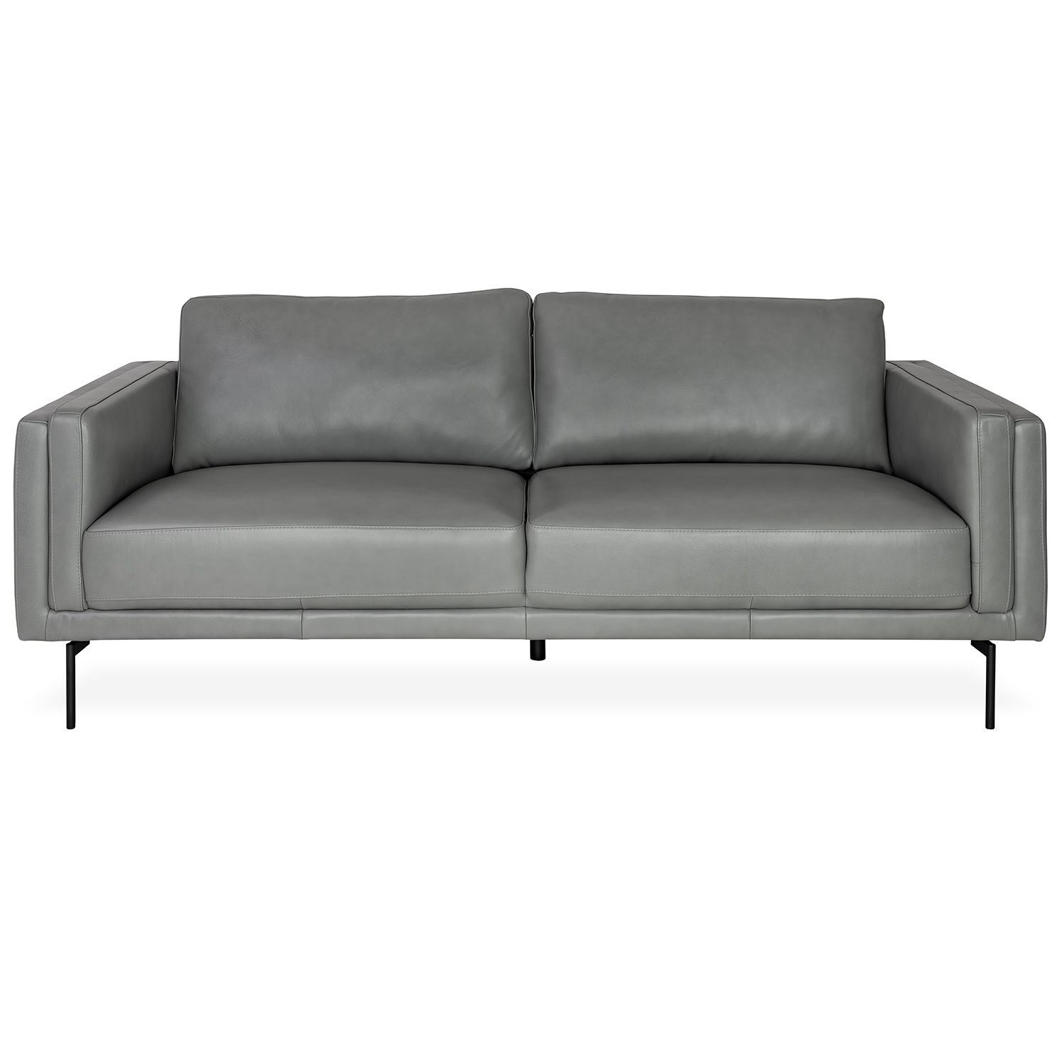 The Bentley Sofa features sleek lines, two wide, deep seats, and Montana leather upholstery in a neutral shade of grey. Bentley's double armrests add an extra layer of comfort, while its slim black metal legs lend it an appearance of lightness. Part of Copenhagen's Essentials Collection, Bentley's elegant simplicity and soft, buttery leather will add a welcoming ambiance to any room.