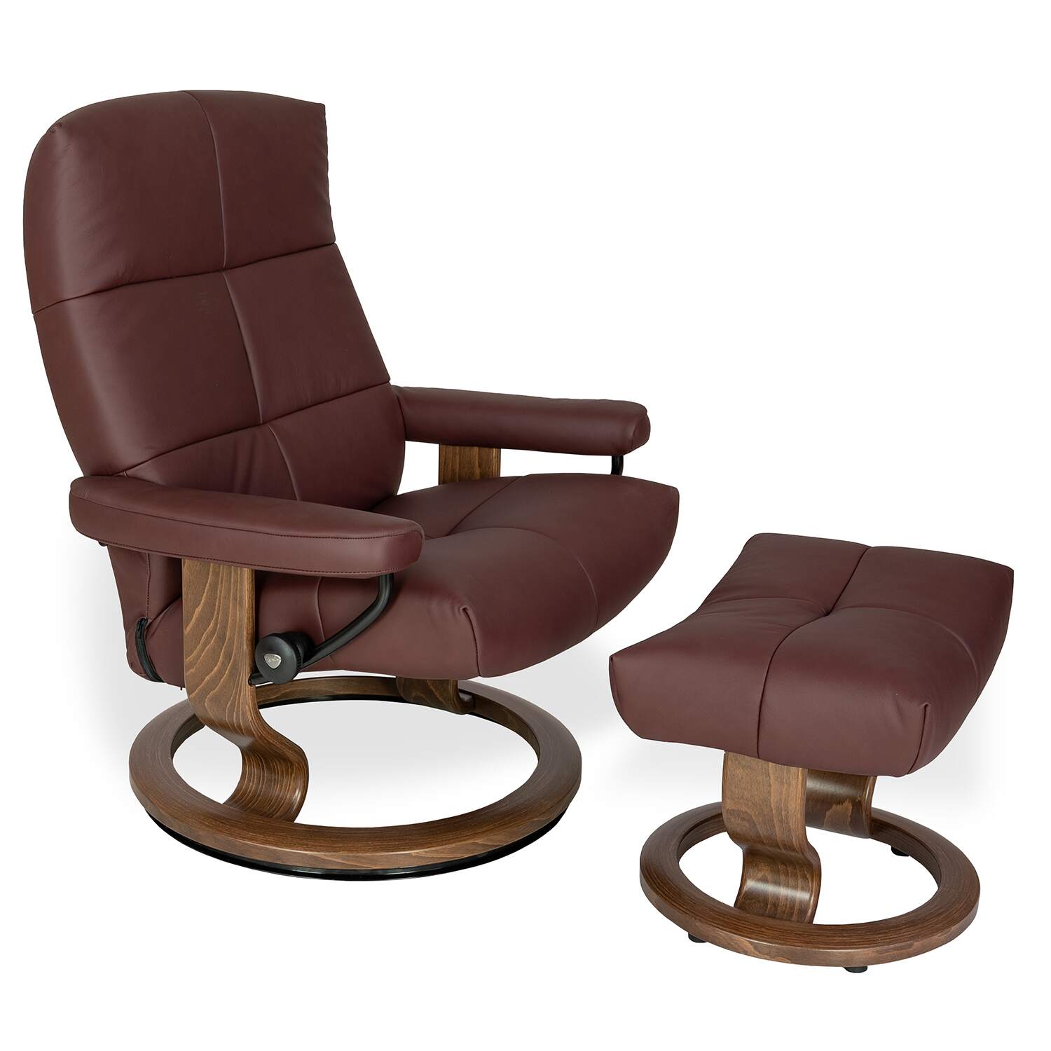 The Bergen Medium Chair and Ottoman, designed by Stressless of Norway, has a distinctive design with cutting edge comfort technology. Its unique stitch pattern was inspired by traditional origami techniques, creating a delicate yet tailored look that lends itself well to a variety of design environments. Bergen includes the patented Plus and Glide systems which allow the chair to provide continuous support for the head and lower back, while also adjusting the reclining angle based on shifts of the body. Shown with a Classic circular bent beech wood base with a walnut stain and Paloma bordeaux leather.