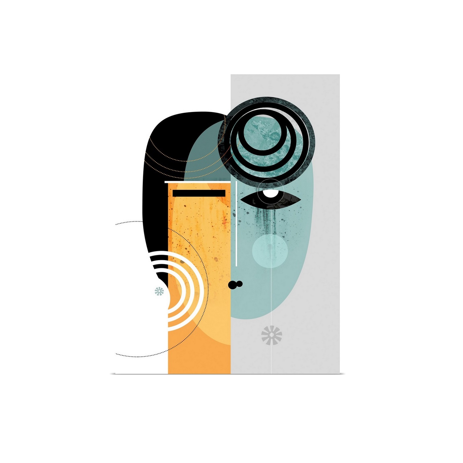The Betrayal of the King Wall Art is a contemporary, cubist-inspired piece that uses geometric shapes, spirals, and stars to form an abstract human face. The combination of bold teals and yellows with monochromatic greys creates a cool-toned look for an intriguing yet soothing effect. Betrayal of the King has a gloss finish and bleeding borders.