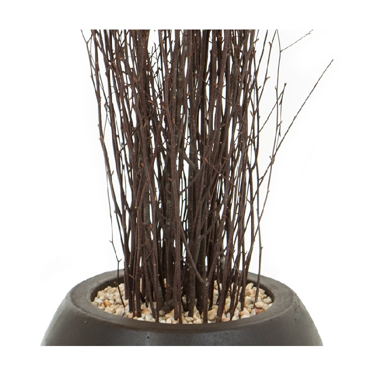 [0] => This birch stick plant makes a bold statement, with long branches weaving together to slightly angle at the ends. The rounded black pot holds white pebbles, for a two-tone monochromatic look. An easy way to accessorize any modern home.