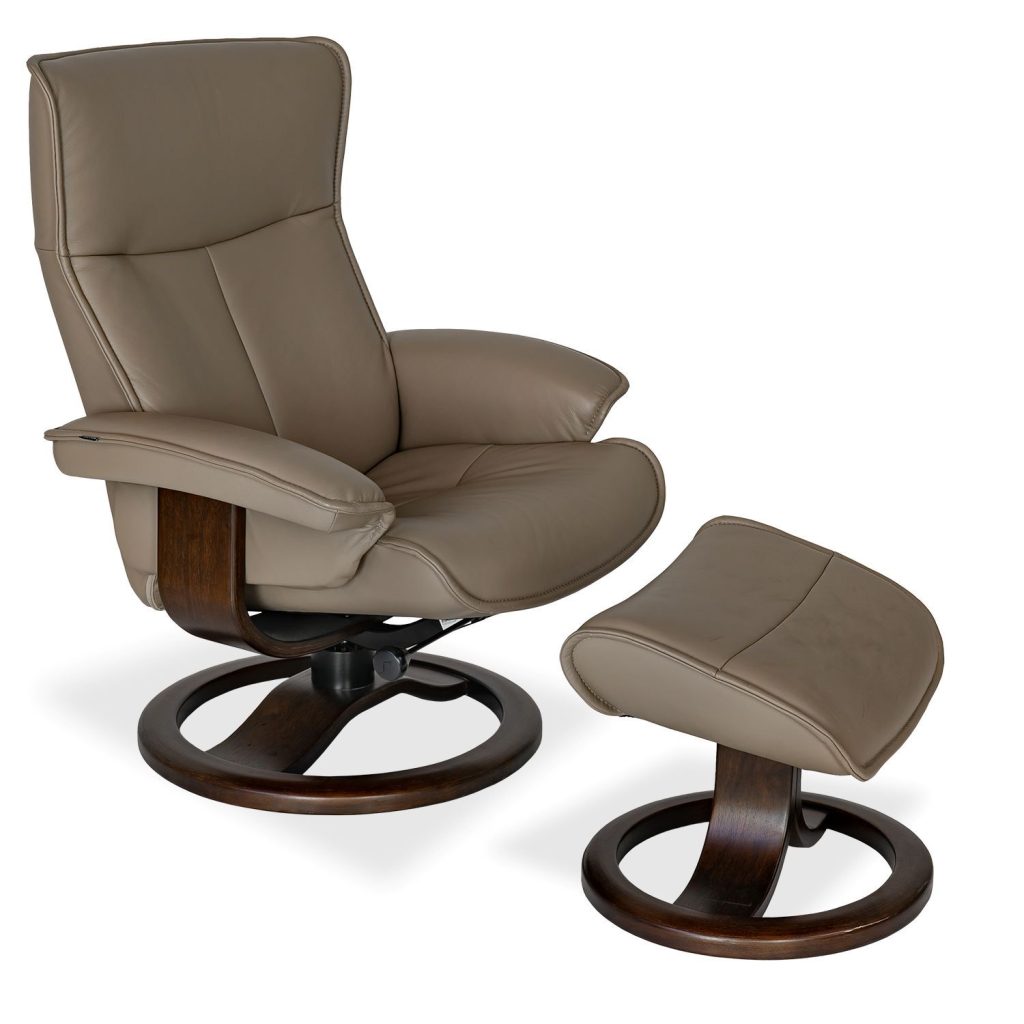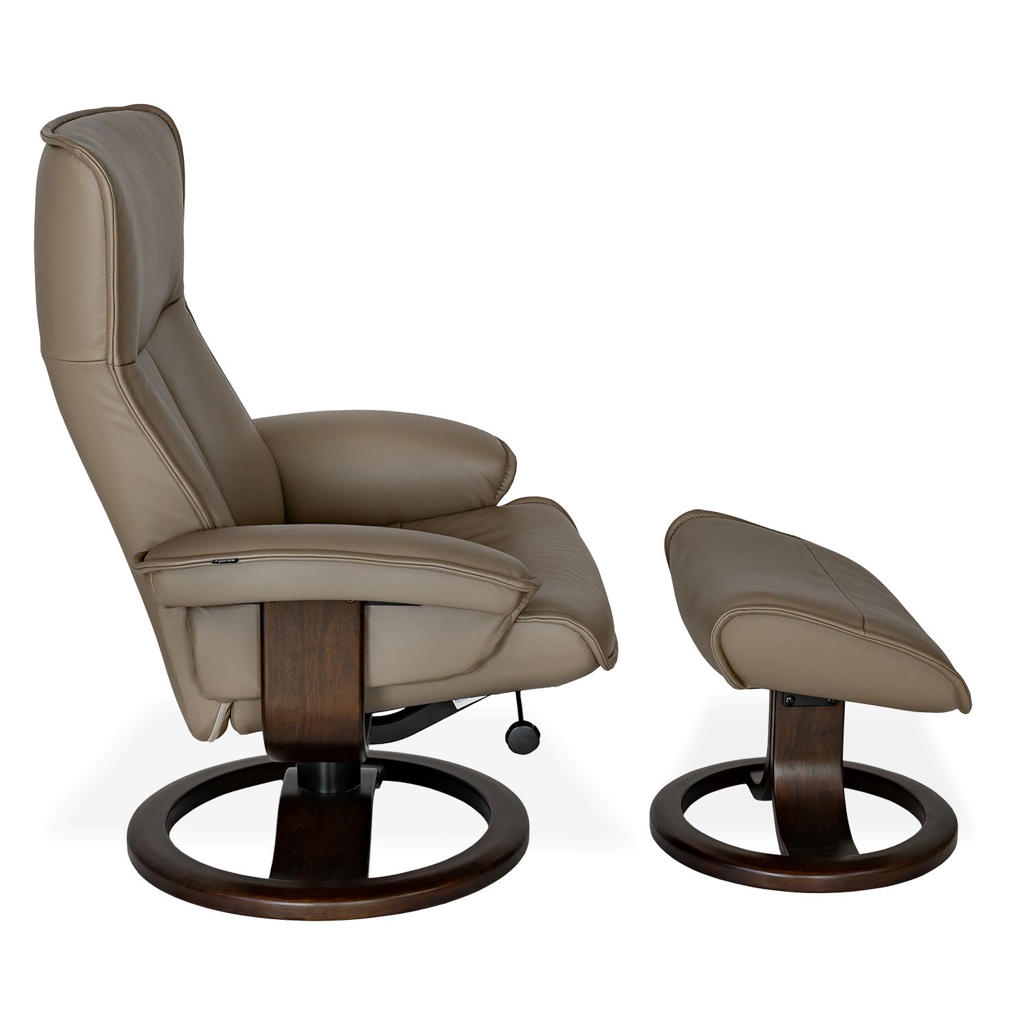 With a contemporary, ergonomic design, the Bismarck Large Recliner is engineered for your comfort. The recliner features the Fjords® Active Release System™, which adjusts the neck angle of the seat as you move. The 360° swivel base in espresso-stained wood laminate makes it easy to place the chair anywhere in a room. The gentle rounded lines of the base complement the graceful curves of the seat, and the soft nougat top-grain leather adds another layer of comfort and the feel of everyday luxury.