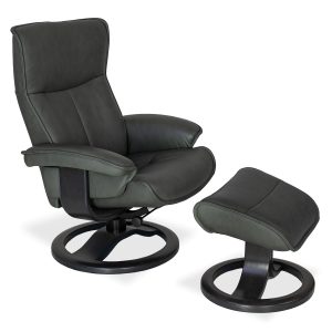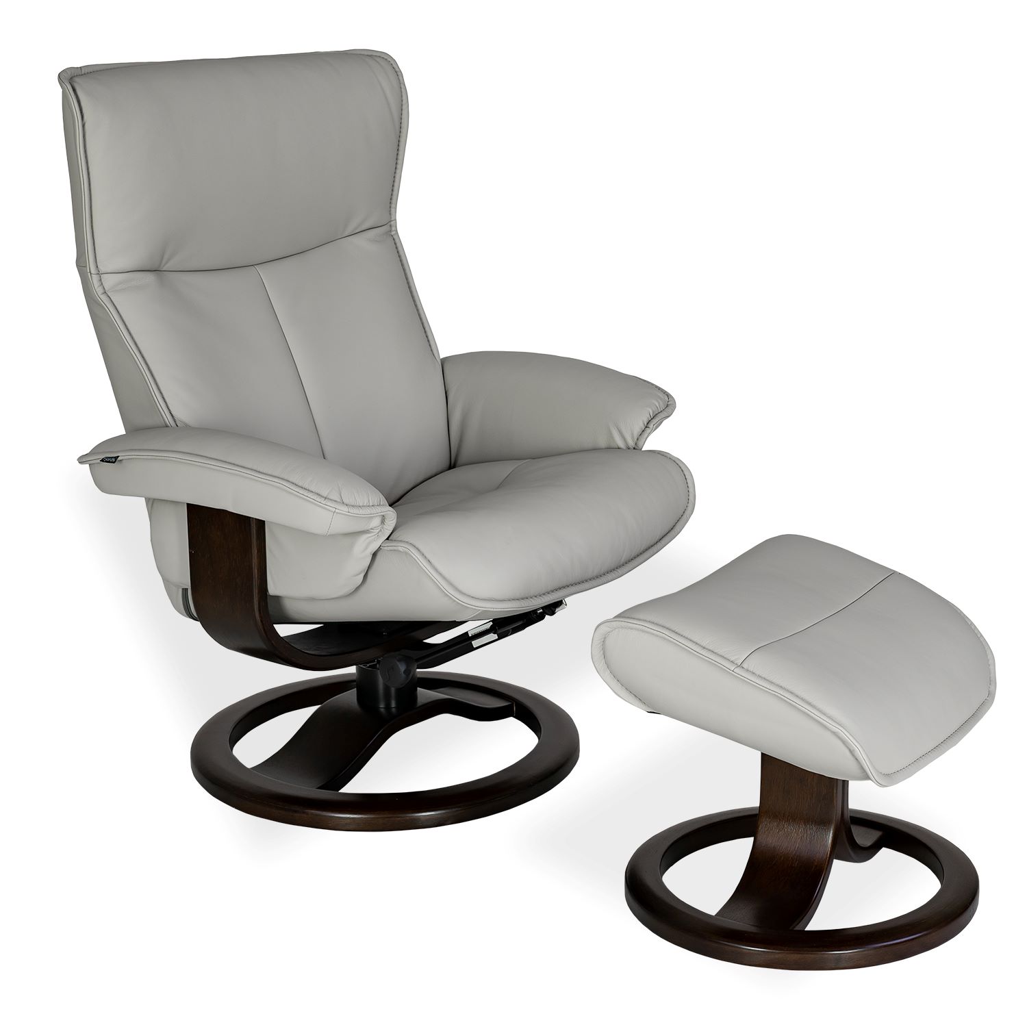 With a contemporary, ergonomic design, the Bismarck Small Recliner is engineered for your comfort. The recliner features the Fjords® Active Release System™, which adjusts the neck angle of the seat as you move. The 360° swivel base in espresso-stained wood laminate makes it easy to place the chair anywhere in a room. The gentle rounded lines of the base complement the graceful curves of the seat, and the shadow grey top-grain leather adds another layer of comfort and the feel of everyday luxury.
