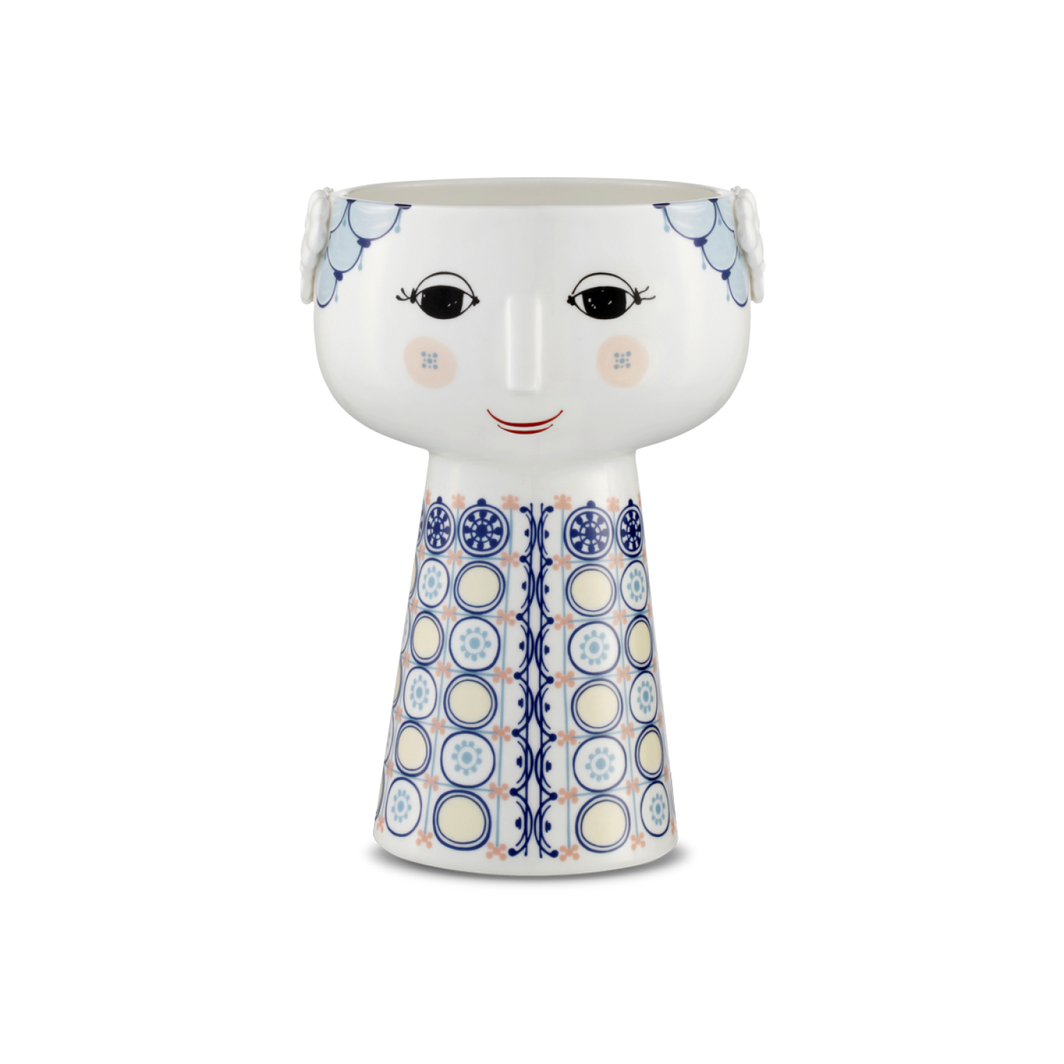 The Bjorn Wiinblad Eva Vase represents the work of Danish multi-talented artist Bjorn Wiinblad. This vase features his trademark style, with soft colors of blue, pink, and yellow, natural motifs, and whimsical lines forming the curious, charming gaze of a woman. Though modern and functional, this piece represents timeless Danish designs that have been collectors' items since their debut in the 1950's. Eva's personality and complementary hues make this vase perfect for displaying on a shelf, or filling with fresh-cut flowers or your favorite bouquet for a cheerful accent that will brighten up any room.