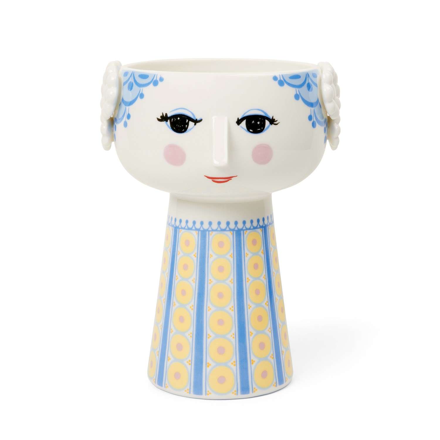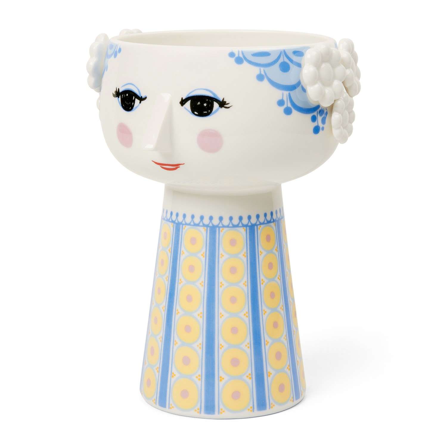 The Light Blue Eva Vase represents the work of Danish multi-talented artist Bjorn Wiinblad. Made of glossy glazed ceramic, Eva has a whimsical smiling face on a wide head with blue accents, supported by a cone-shaped body with a pattern of yellow circles and blue stripes. Though modern and functional, this piece hearkens back to Danish designs that have been collectors' items since the 1950's. Whether you fill this vase with fresh flowers, a faux bouquet, or simply display it as an art object, Eva is the perfect companion for brightening up your space.