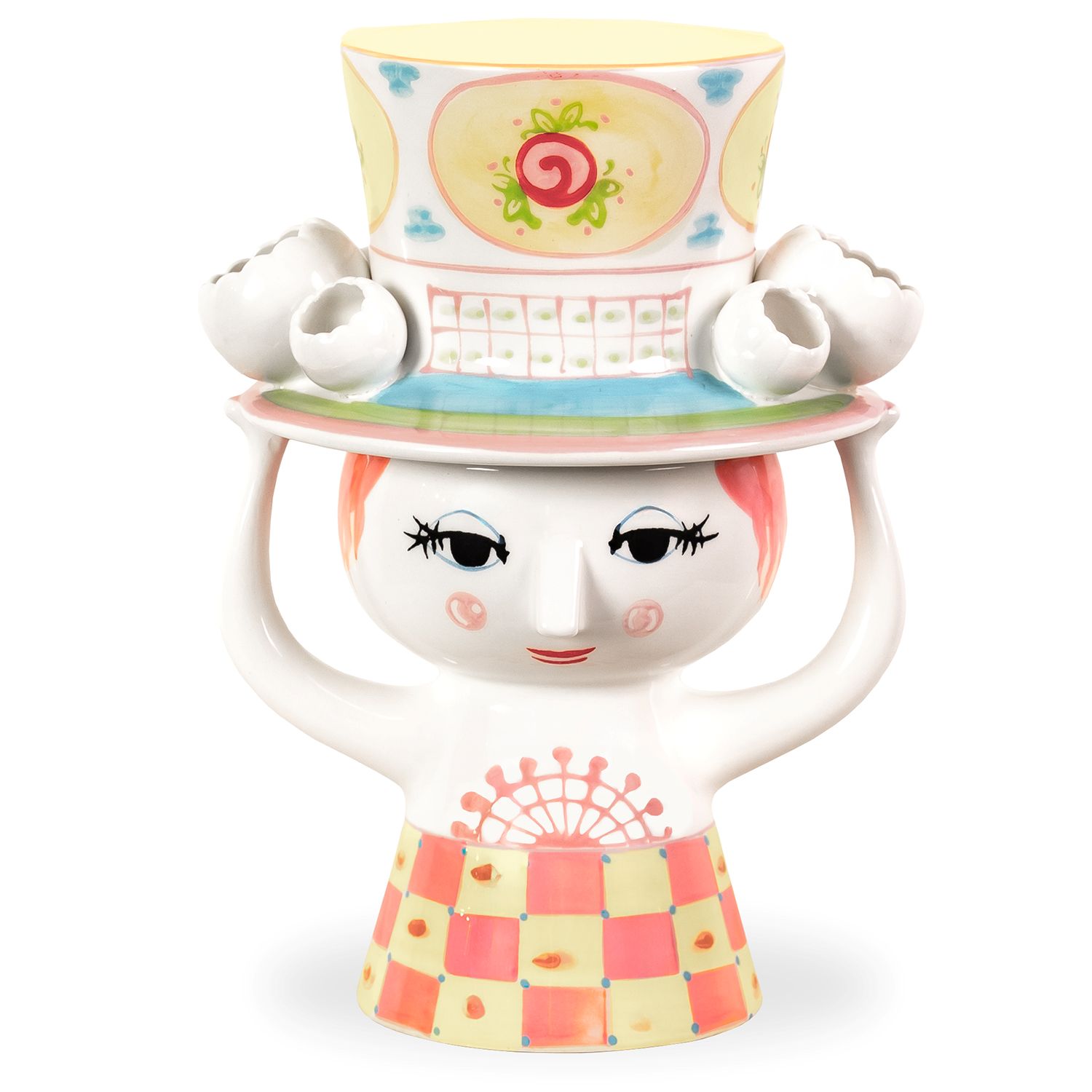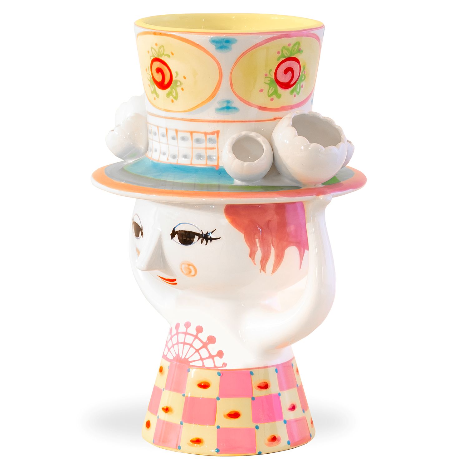 The Eva with Hat Vase represents the work of Danish multi-talented artist Bjorn Wiinblad. Made of hand-painted ceramic with a glossy finish, this vase's form depicts a woman with her arms raised to support the hat on her head. The whimsically oversized hat and cone-shaped dress are adorned with gridded and floral motifs in cheerful pink and yellow. Though modern and functional, this piece hearkens back to Danish designs that have been collectors' items since the 1950's. Whether you fill this vase with fresh flowers, a faux bouquet, or simply display it as an art object, Eva with Hat is the perfect companion for brightening up your space.