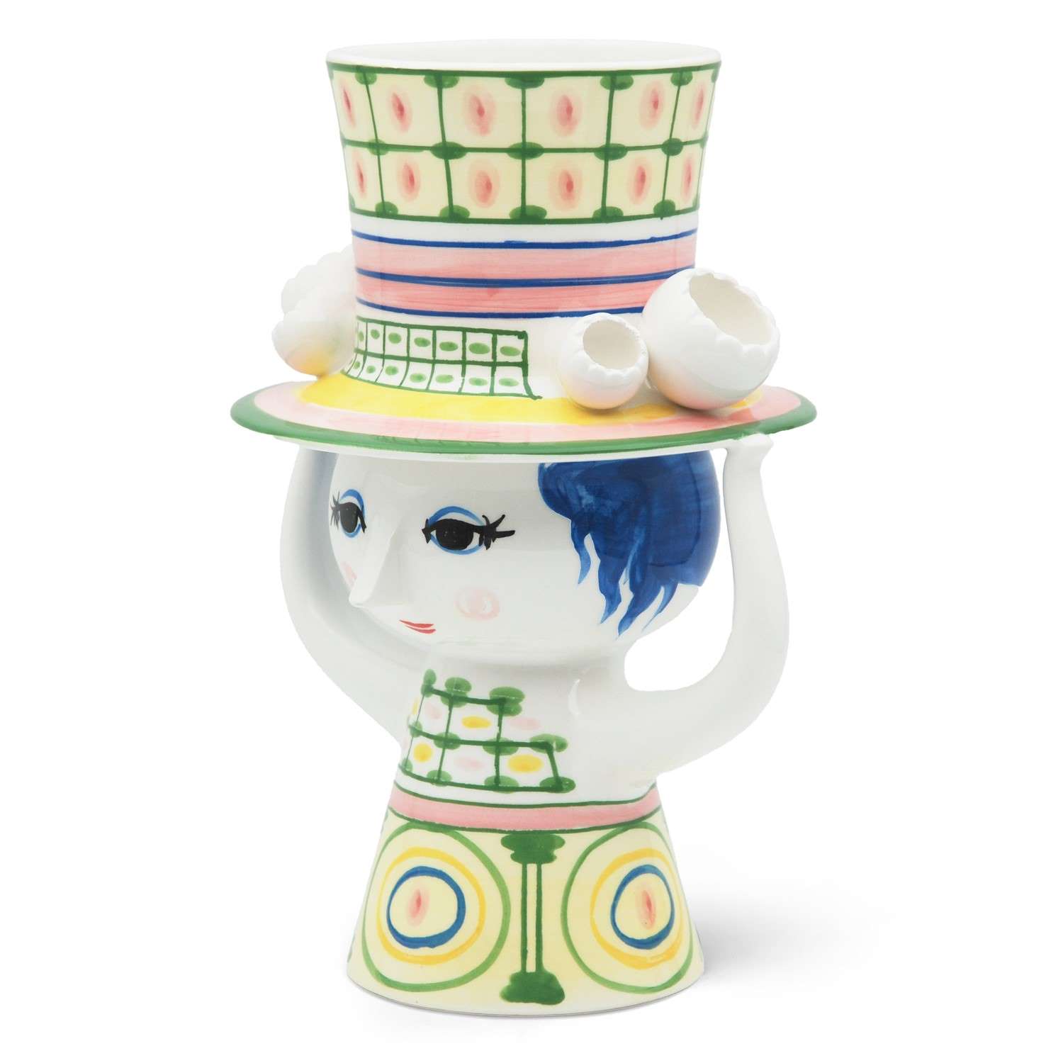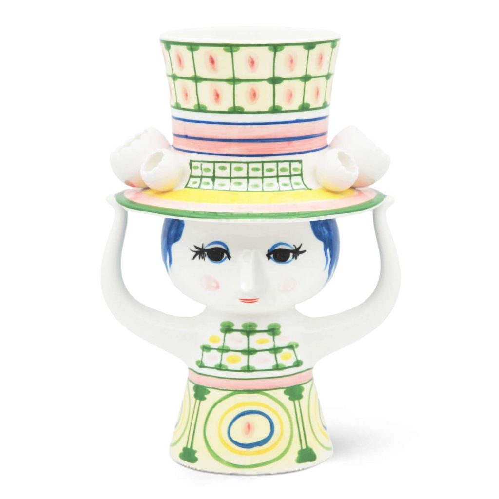[0] => The Green Lady with Hat Vase represents the work of Danish multi-talented artist Bjorn Wiinblad. Made of hand-painted ceramic with a glossy finish, this vase's form depicts a woman with her arms raised to support the hat on her head. The whimsically oversized hat and cone-shaped dress are adorned with gridded and circular patterns in green, yellow, pink, and blue. Though modern and functional, this piece hearkens back to Danish designs that have been collectors' items since the 1950's. Whether you fill this vase with fresh flowers, a faux bouquet, or simply display it as an art object, the Lady with Hat is the perfect companion for brightening up your space.