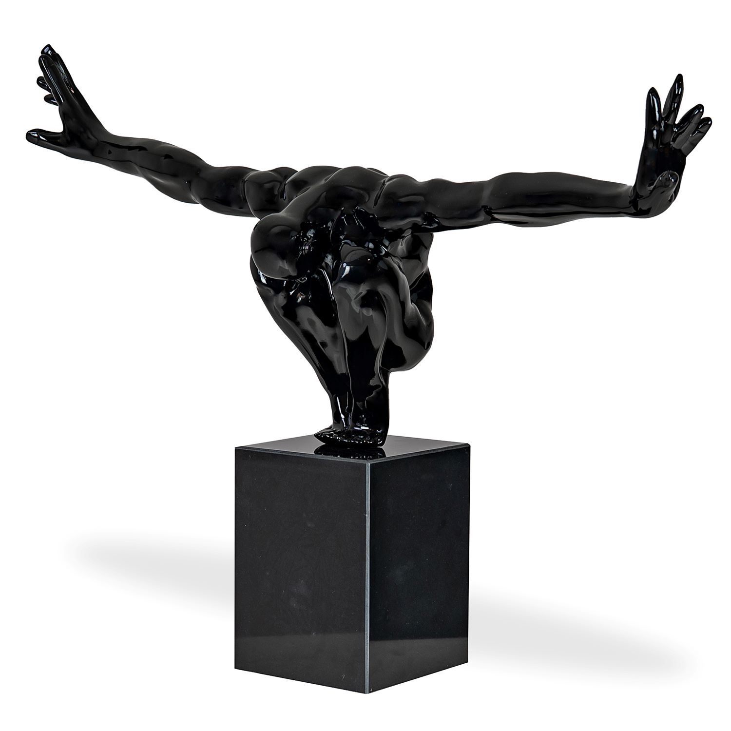 The Black Baron Sculpture depicts a crouched figure with their arms extended out to the side, evoking boldness, power, and vulnerability all at once. The sculpture's muscled form brings a sense of strength and dynamic motion to your space, while the black stone base lets it easily sit on any display surface.