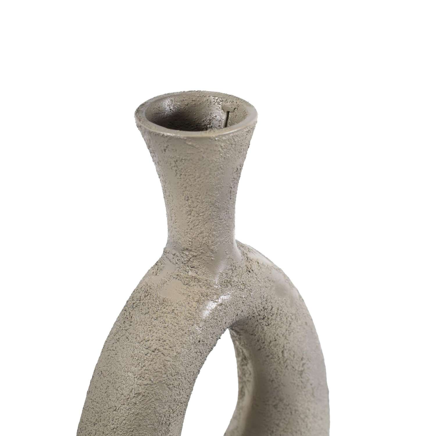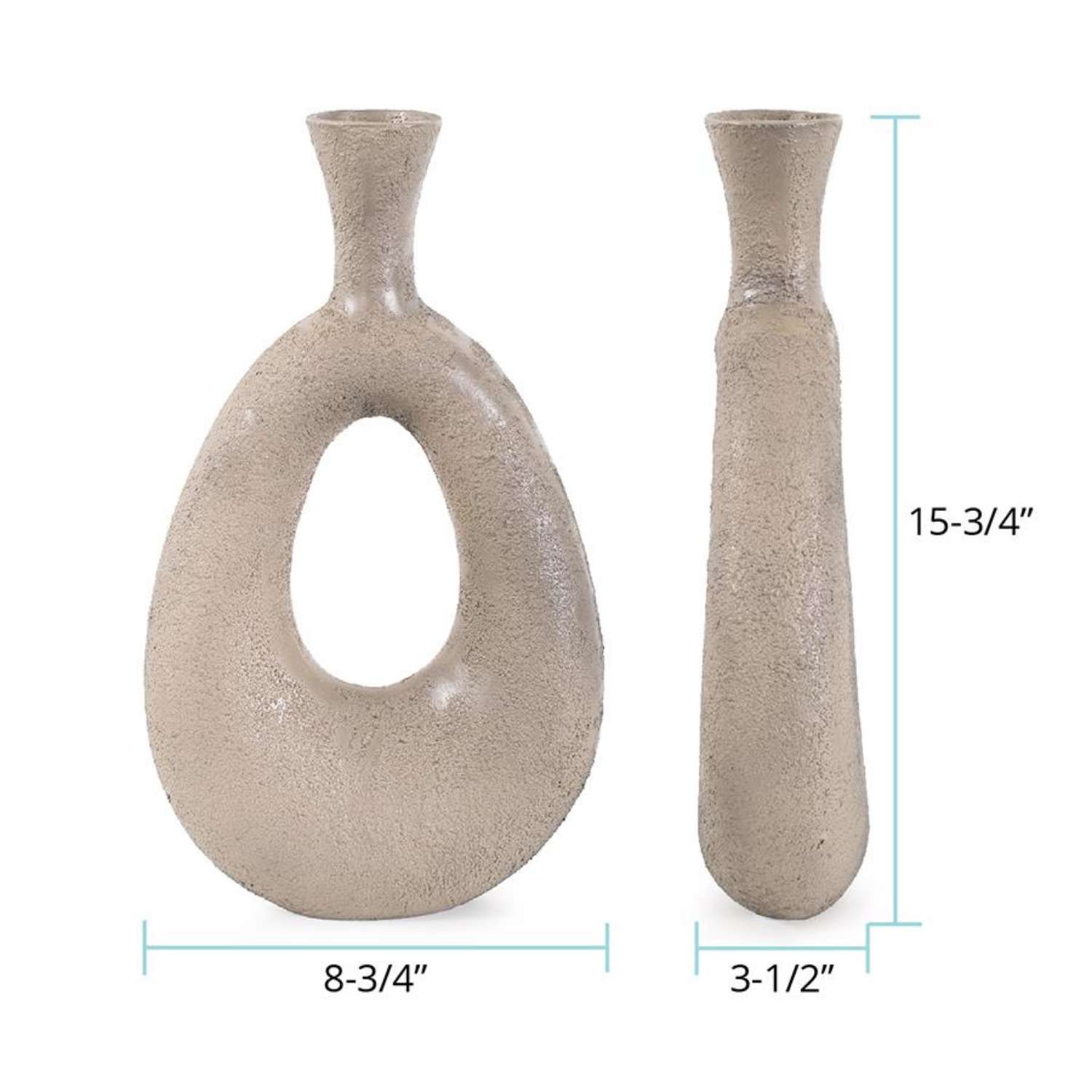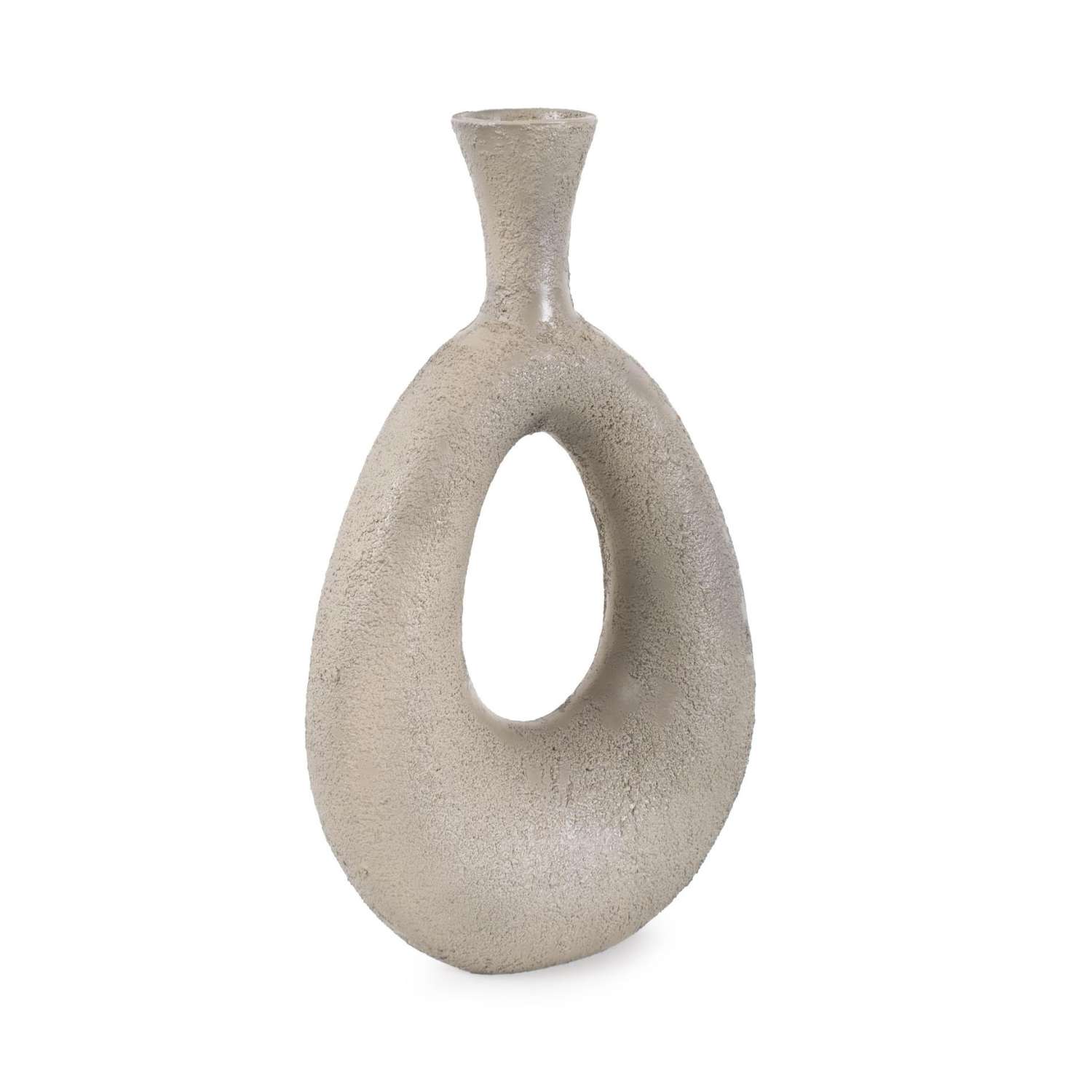 [0] => The Blanton Textured Flared Vase is made of aluminum with a taupe finish and a slightly rough surface reminiscent of unfinished clay. Its teardrop shape with a hole in the center makes it a unique vessel for artificial flowers or foliage. Blanton's neutral tone and earthy texture create an understated accent for minimalist, industrial, or contemporary interiors.