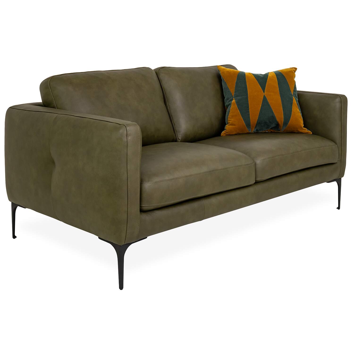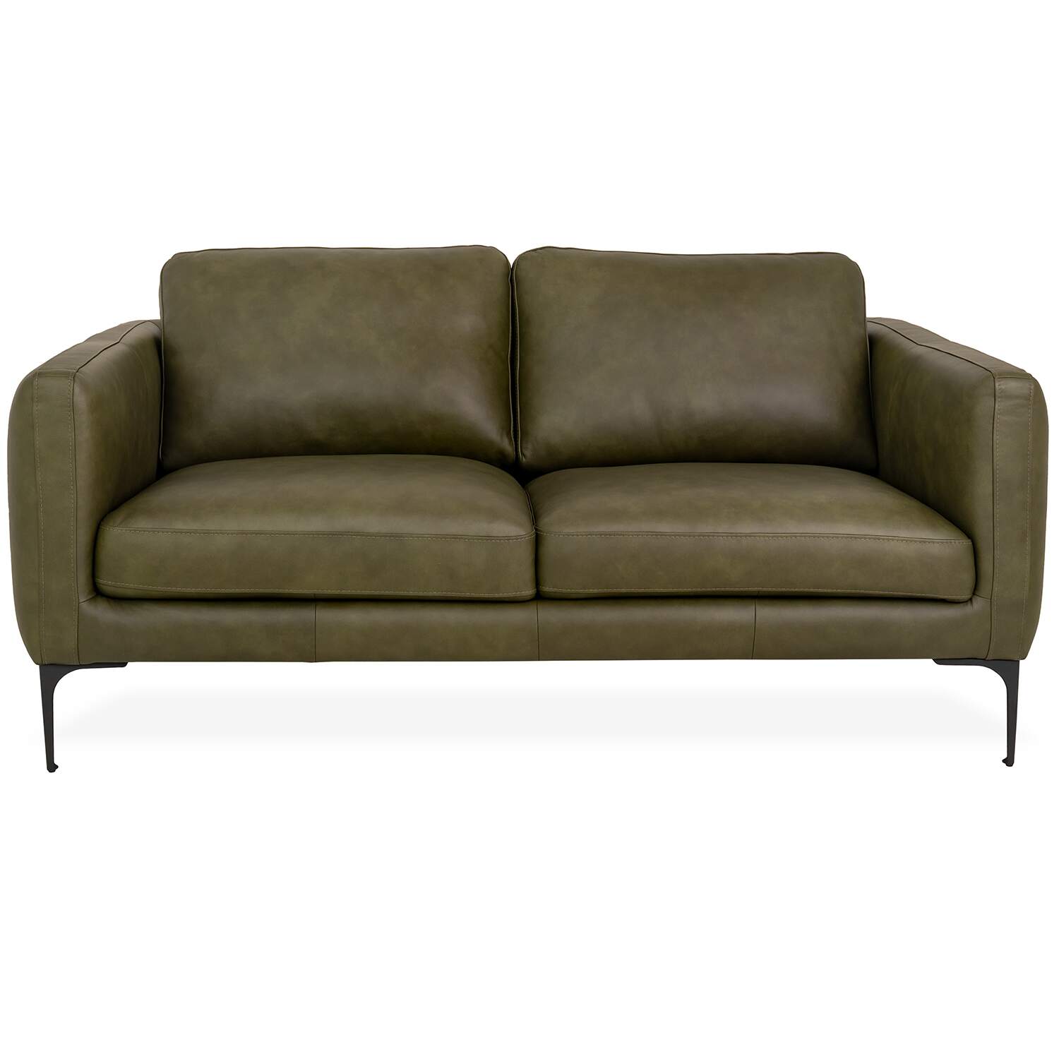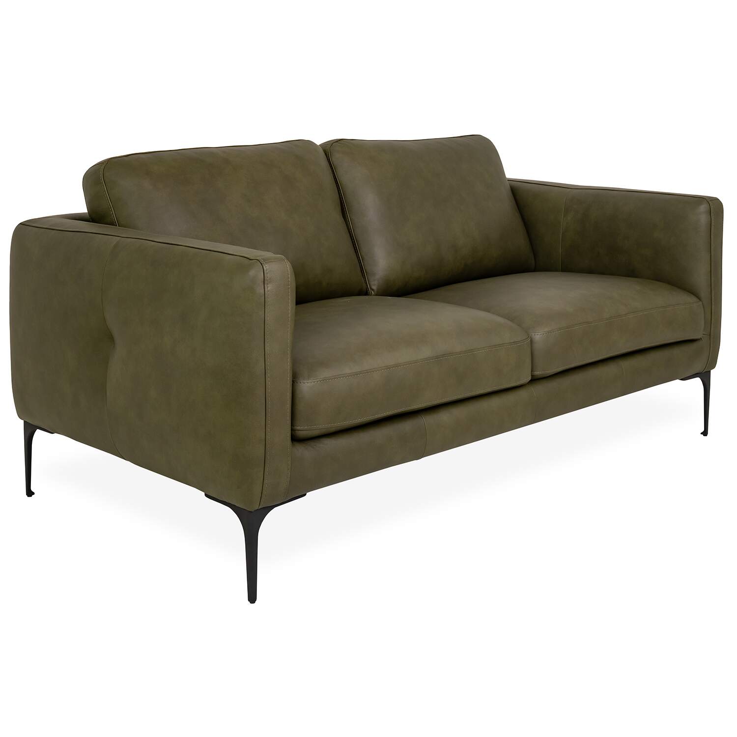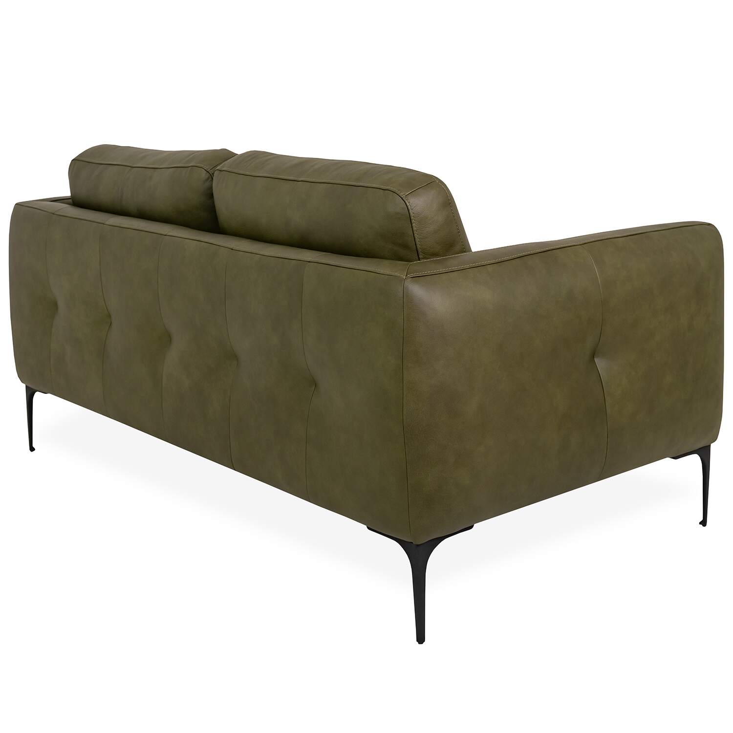 Upholstered in evergreen leather, the Blios Loveseat features soft cushions and stylish tufting along its back and sides. The back cushions are mounted with Velcro for easy removal, while the matte black metal legs have a slim shape that forms a contrast with the loveseat's fuller profile. With its classic look and deep color, Blios will complement a variety of interiors both traditional and modern.