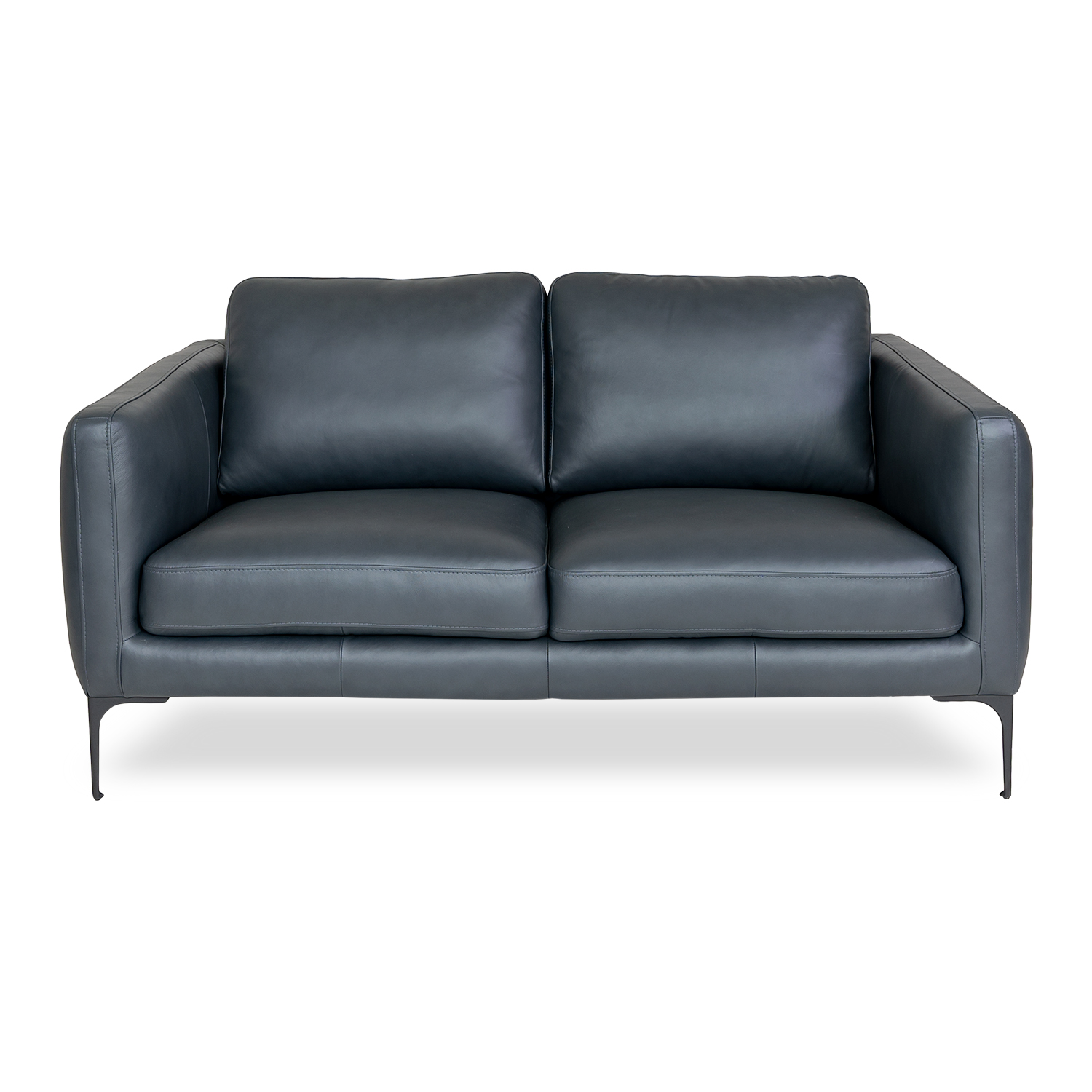 [0] => Upholstered in dark blue leather, the Blios Loveseat features supportive seat cushions and stylish tufting along its back and sides. Soft back cushions are mounted with Velcro for easy removal, while the matte black metal legs have a slim shape that forms a contrast with the loveseat's fuller profile. With its classic look and deep color, Blios will complement a variety of interiors both traditional and modern.