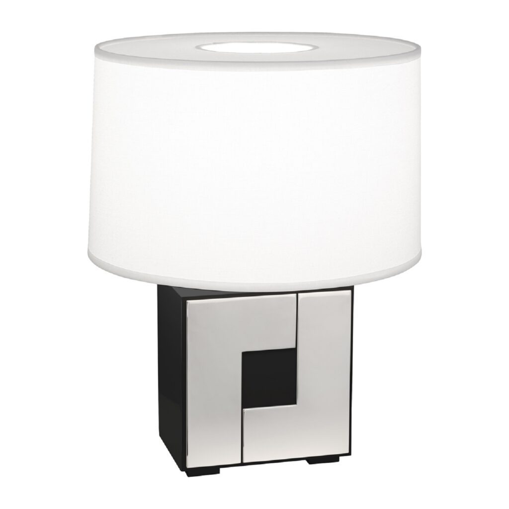 [0] => The Blox Table Lamp features a distinctive base with L-shaped blocks that frame a black center square. The black enamel finish and polished nickel accents highlight the geometry in the design, attractively contrasting with the bright Ascot white fabric shade. With its eye-catching pattern, this lamp can accent any type of design environment.