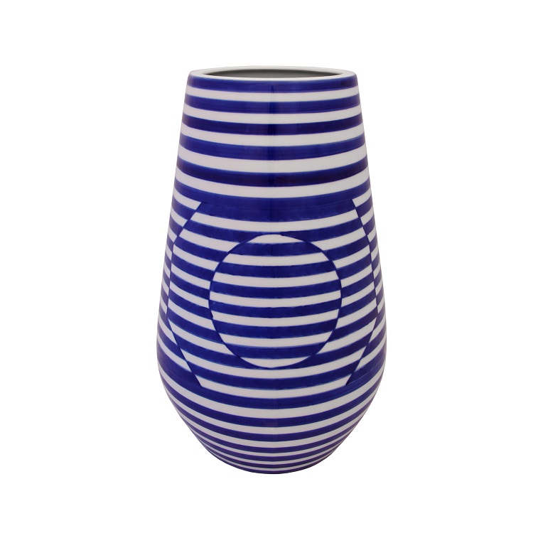 The Blue and White striped vase, crafted from ceramic, offers an interesting optical illusion with the pattern of navy and white striped circles.