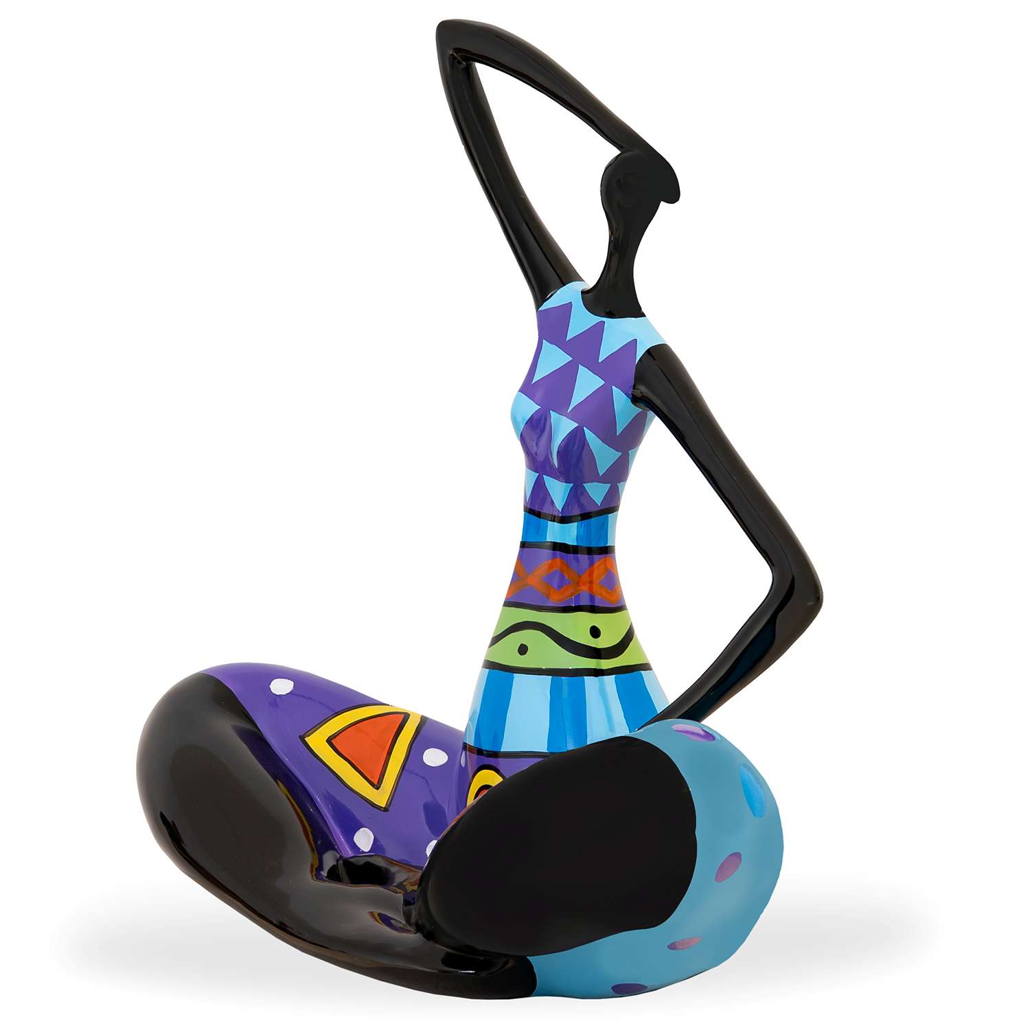 [0] => The Blue Girl Sculpture is adorned with a mix of fun patterns and shapes, including polka dots, triangles, diamonds, and stripes. Made of polyresin with a glossy finish, this sculpture depicts a woman sitting with her legs crossed and one hand resting on her head. Blue Girl has a chic color palette of purple, blue, green, yellow, and orange, and can sit on any flat surface.