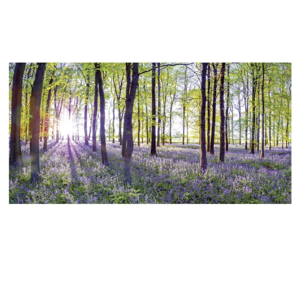 [0] => The Bluebells Wall Art brings a touch of nature and sunlight into your living or office space. This scene showcases the edge of a lush forest, with vibrant green trees and lilac flowers bathed in a subtle glow from the sun. This artwork has a bright, open quality that welcomes peace and introspection.
