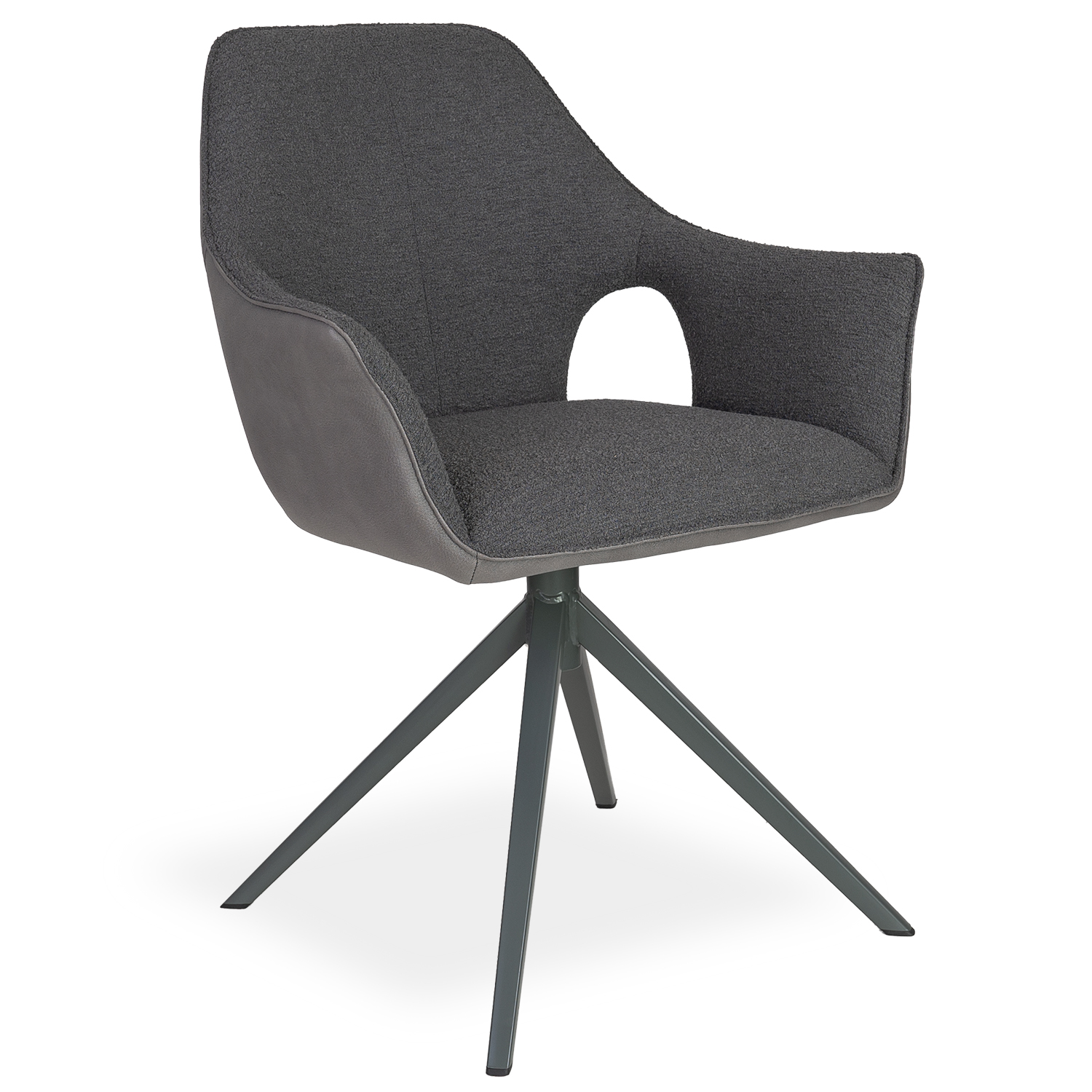 The Bologna Swivel Dining Chair exudes edgy, contemporary craftsmanship. Its squared seat sharply gives way to angled arms that taper out then slope upwards to form the back -- creating a structured look that is softened by rounded edges. Bologna's dark grey fabric upholstery stylishly contrasts with its smooth leather back, accented by tailored stitching along the back and arms, and complements the anthracite metal of its swivel base.