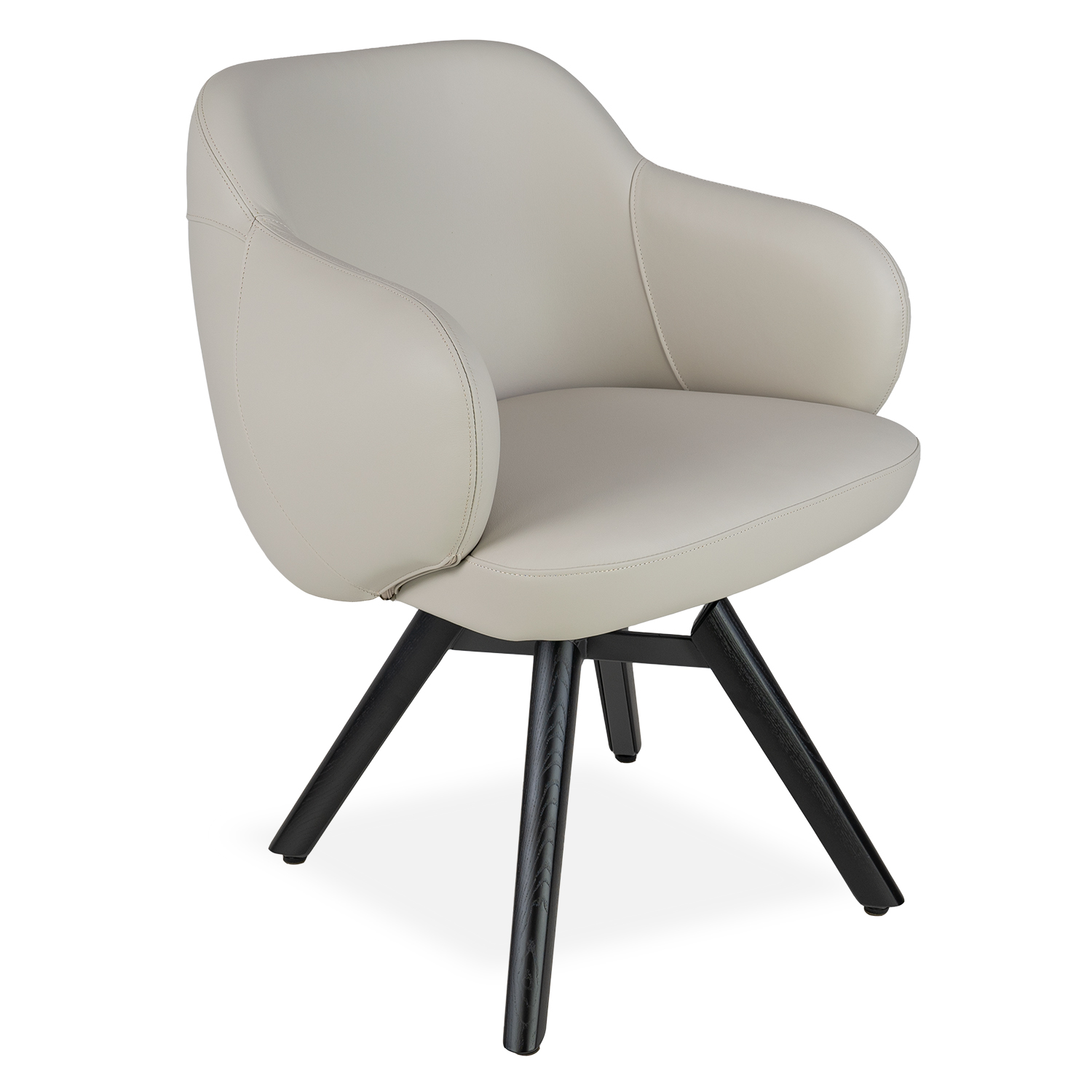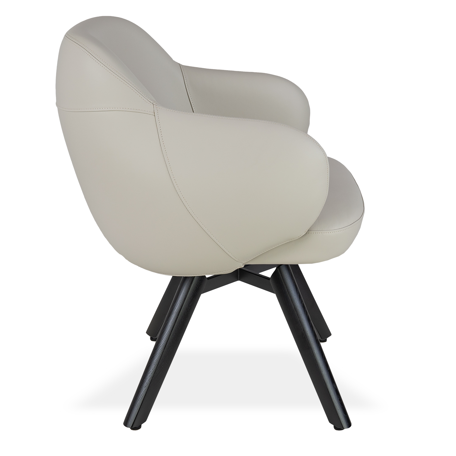 Designed by Paolo Cattelan, the Bombe Dining Chair sports a plush, rounded form that is both sophisticated and playful. Bombe is upholstered in soft ecru leather with accent stitching on the seat, back, and arms that creates a tailored look. Made of ash wood with a matte black finish, Bombe's base has four angled legs connected by a steel x-frame with a built-in swivel function. Choose Bombe for a chair that will add instant style and visual impact to your dining setup.