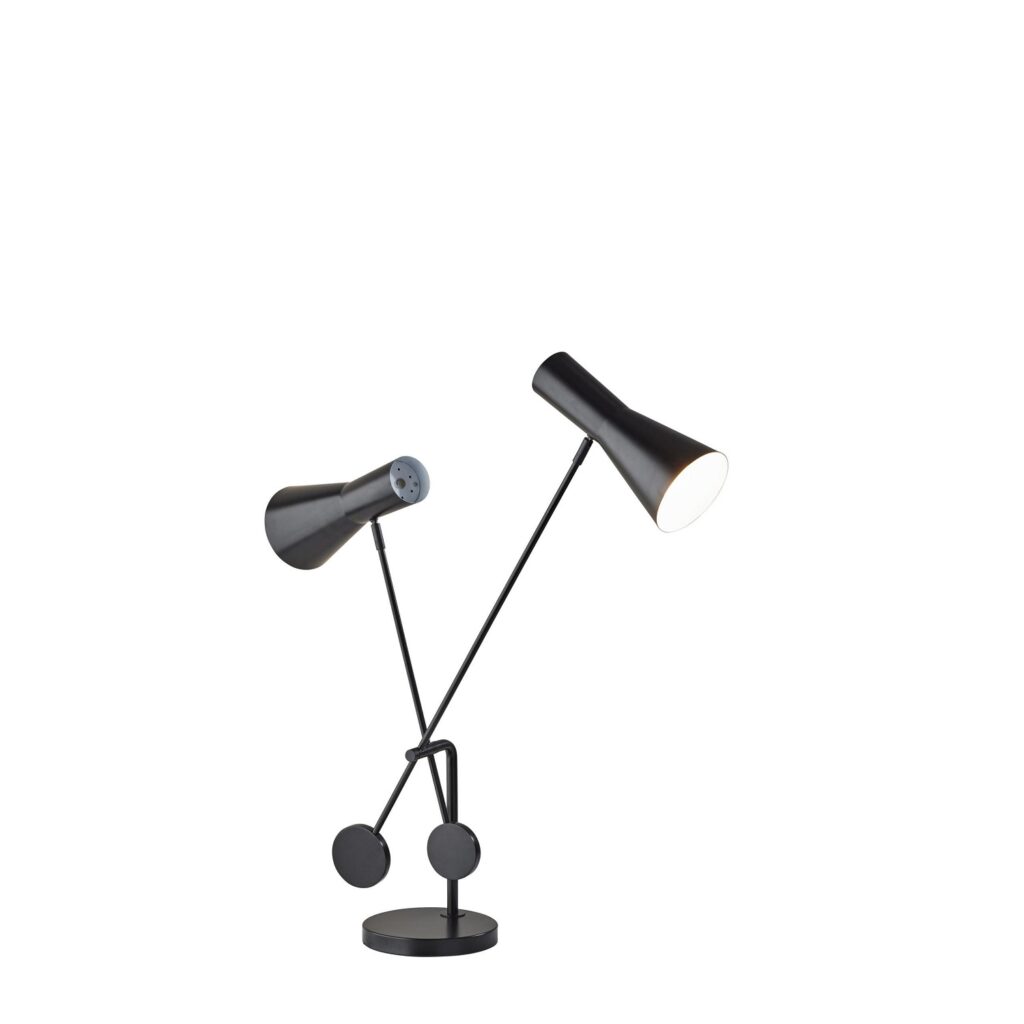 [0] => The Bond Table Lamp features two black cone metal shades with a matching black metal stem and base, and has a clean, contemporary feel. An artistic piece, this lamp was designed to be versatile to your lighting needs, with both the direction of the shades and angle of the stems being adjustable. Simple on/off touch switches are located on the shades. Bond has a 2-Amp USB charging port built into the base. Bond has a 5' black fabric-covered cord and takes two 40W Type A bulbs or two 9W LED bulbs, not included.