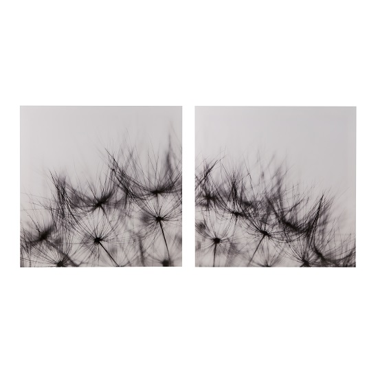 [0] => The Botanical panels on acrylic portray the light seeds of a dandelion in dark hues of grey and black. The panels measure 36'' x 72'' each.