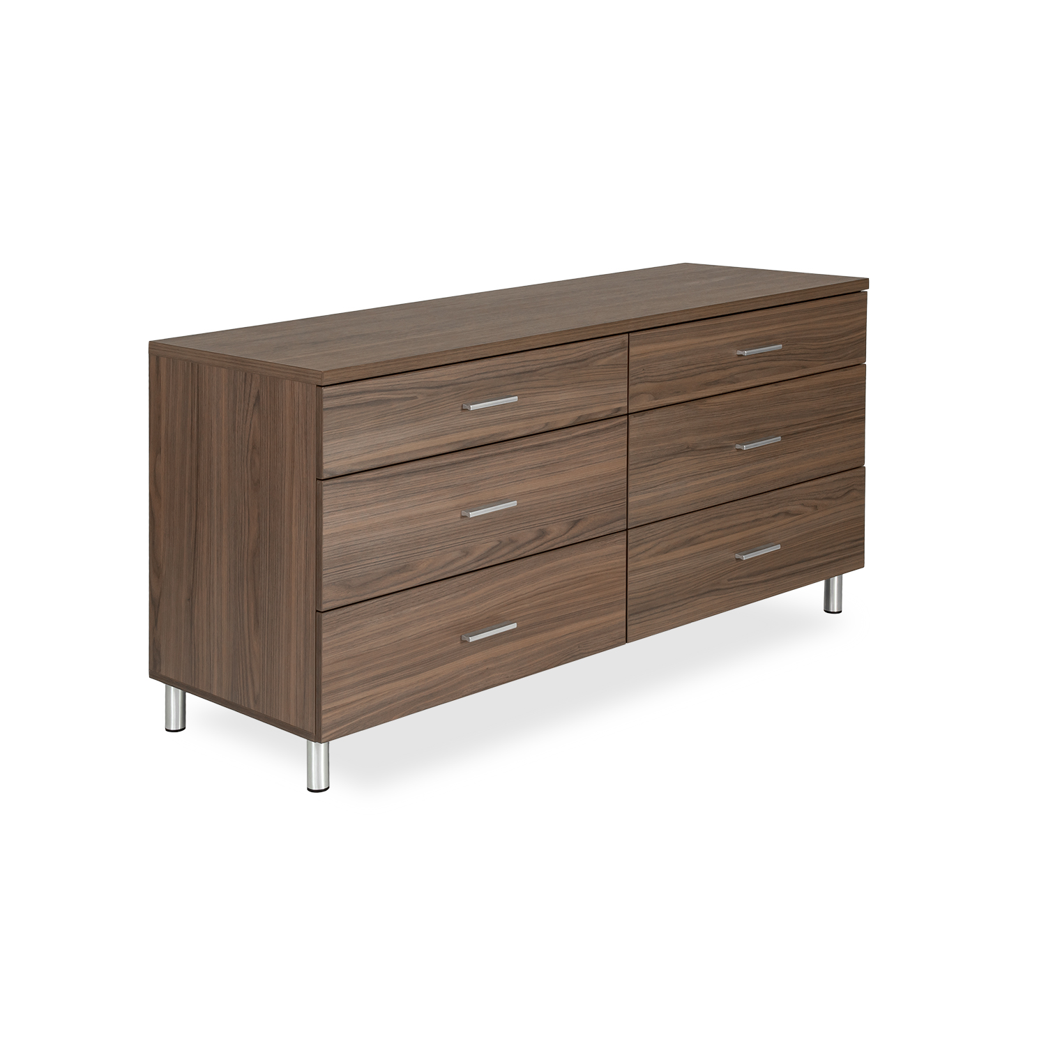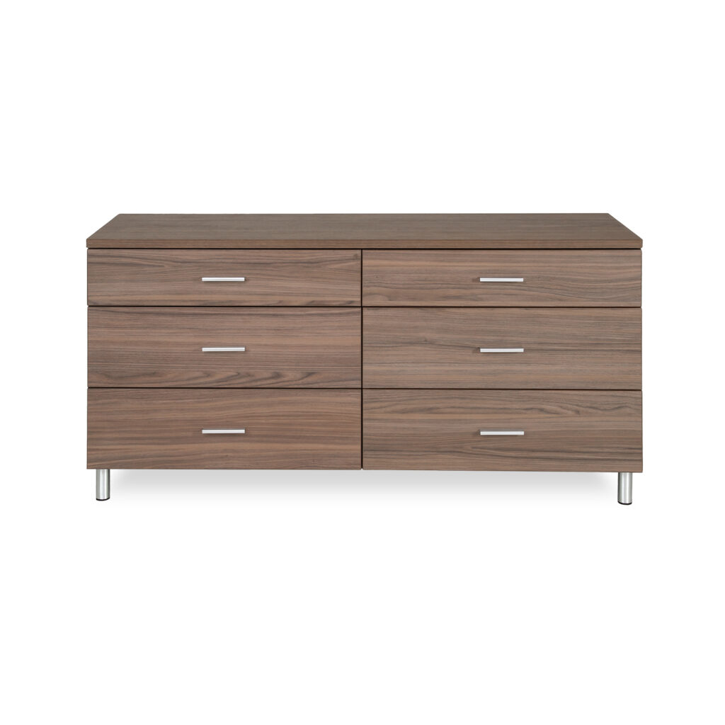 The Bravo Double Dresser features durable walnut melamine with matching metal handles and legs for a contemporary look. The melamine has a textured finish to resemble real wood grain, and the handles are minimalist and sturdy. Six spacious drawers ensure you have ample storage space for your clothes and accessories. Pair this chest with the rest of the Bravo bedroom collection for a truly modern look.