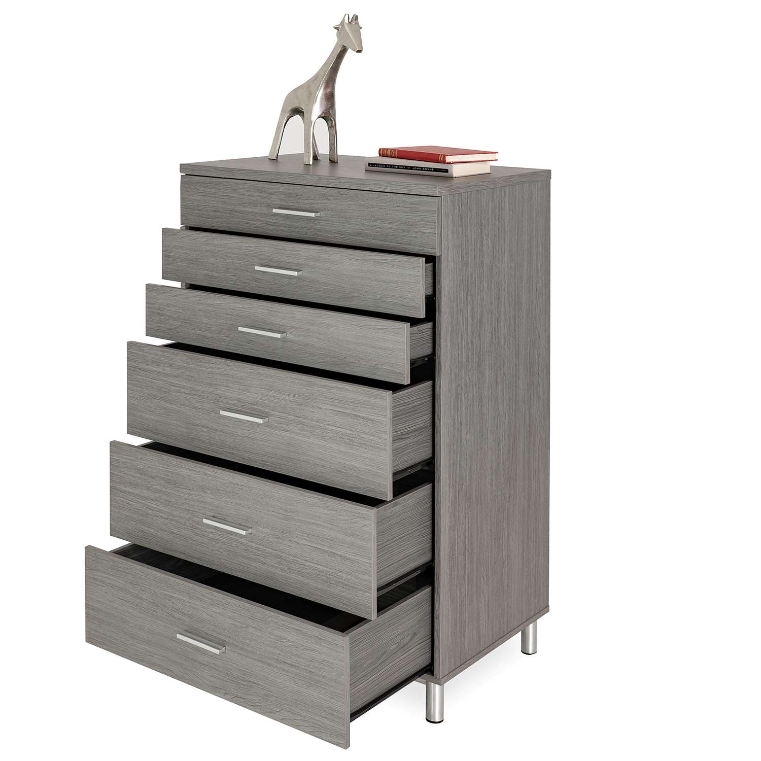 The Bravo High Chest features volcanic ash melamine with matching metal handles and legs. The melamine is textured to resemble real wood and the handles are minimalist and sturdy. Six spacious drawers ensure you have ample storage space for your clothes and accessories. Pair this chest with the rest of the Bravo bedroom set for a truly modern look.