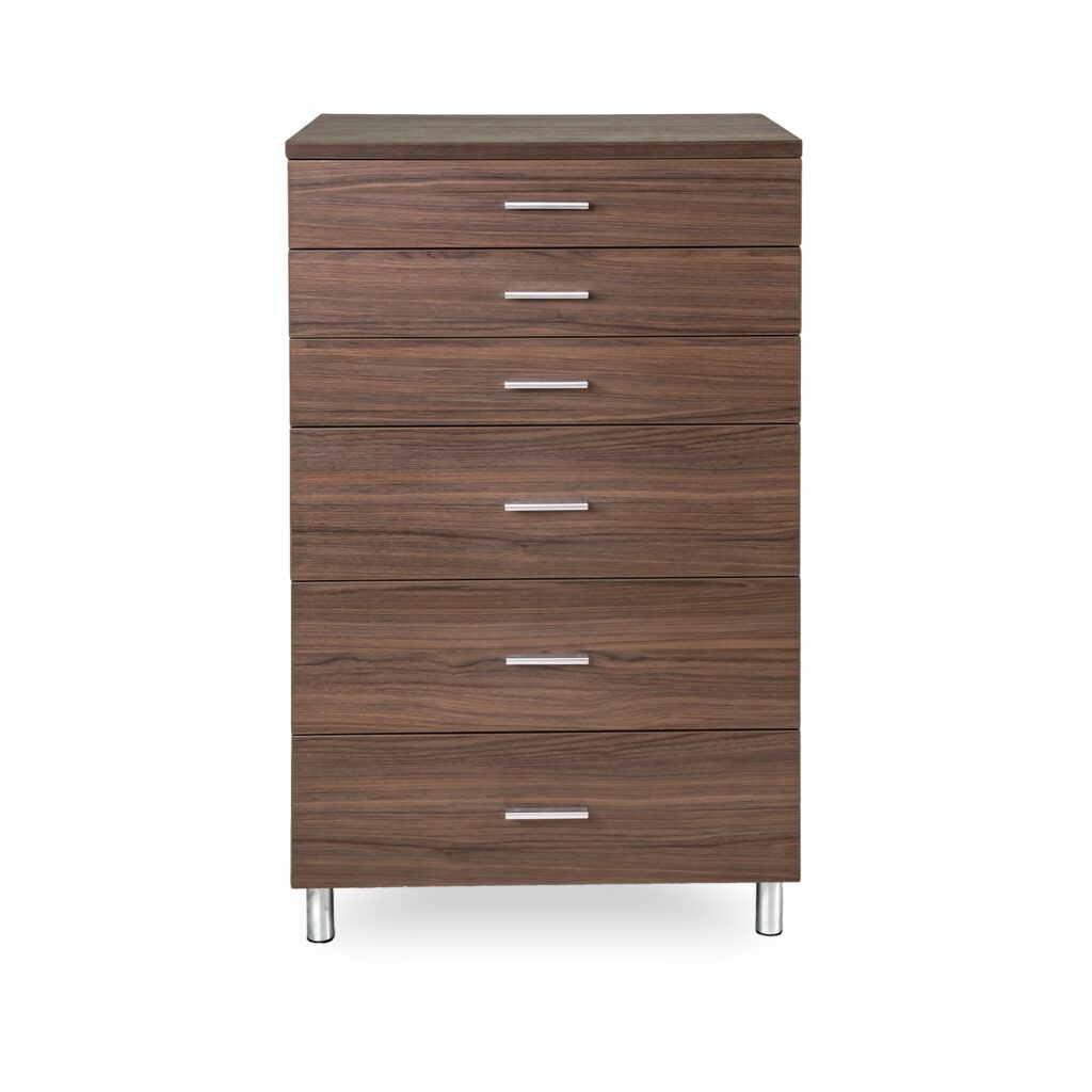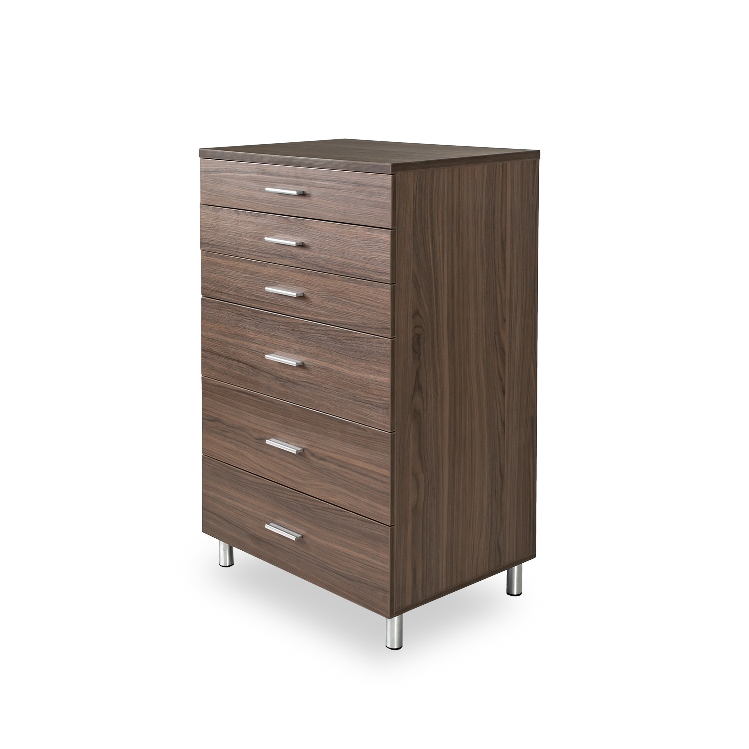 The Bravo High Chest features durable walnut melamine with matching metal handles and legs for a contemporary look. The melamine has a textured finish to resemble real wood grain, and the handles are minimalist and sturdy. Six spacious drawers ensure you have ample storage space for your clothes and accessories. Pair this chest with the rest of the Bravo bedroom collection for a truly modern look.