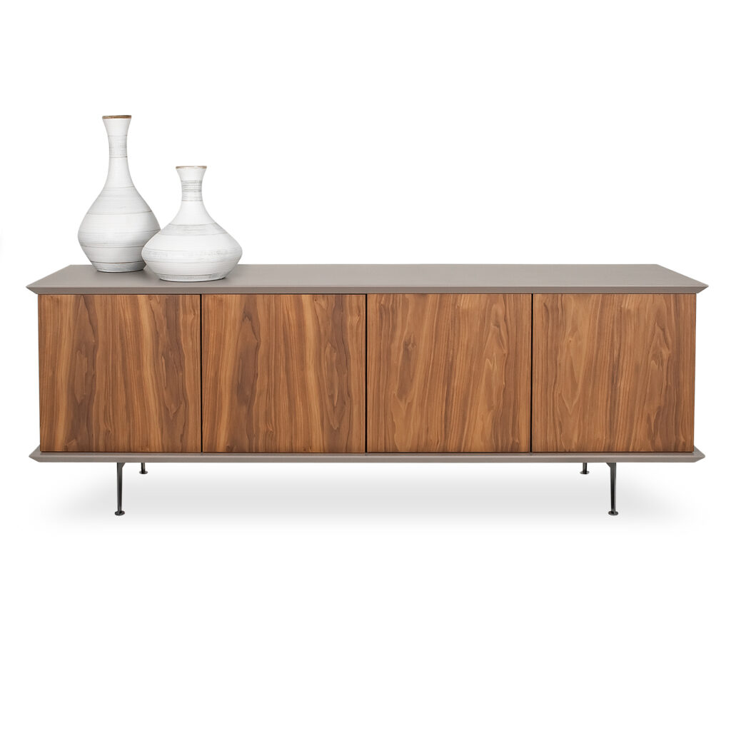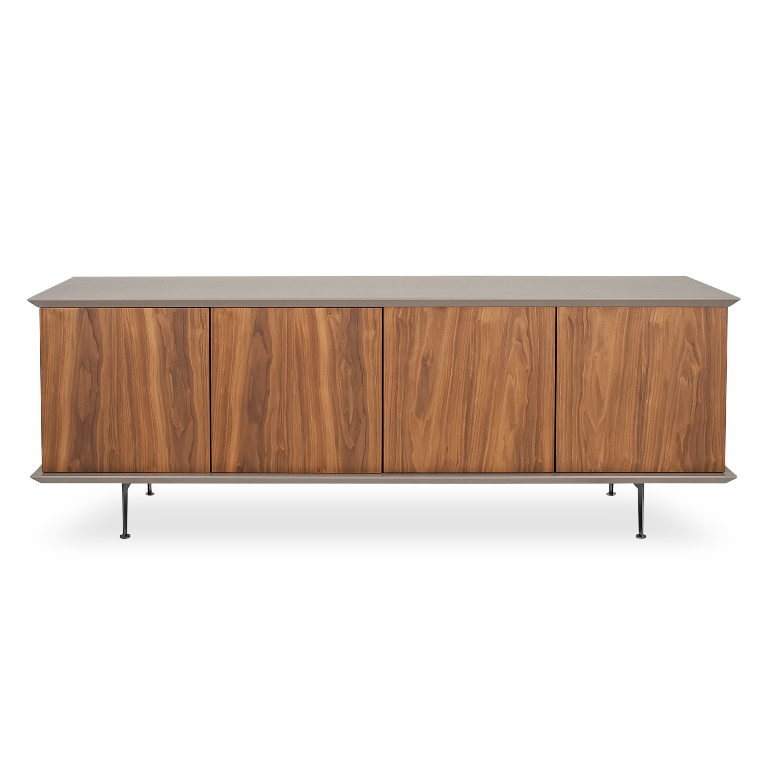 [0] => brera 4 door sideboard with fronts and sies in canaletto walnut, surroiund in x03 grey lacquer, legs in mt98 graphite.