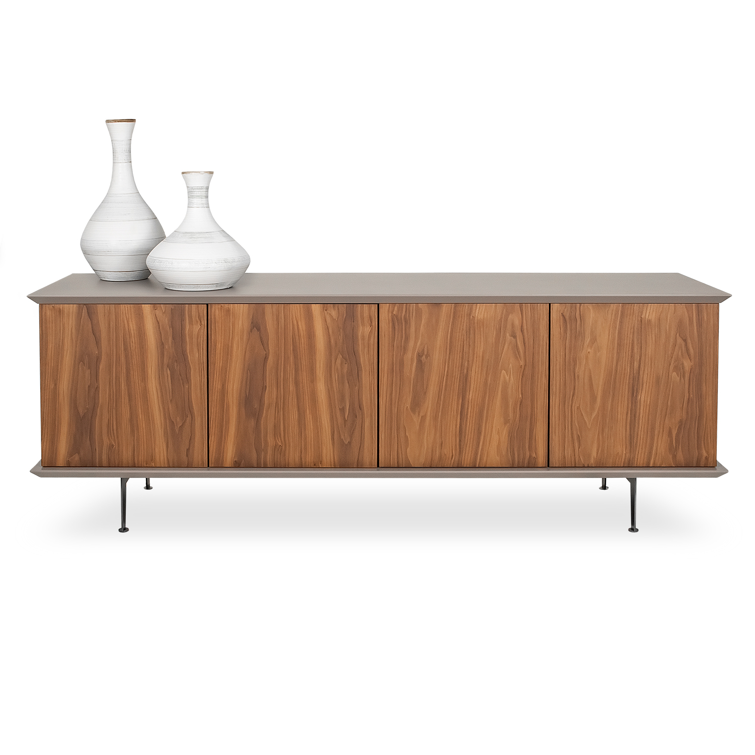 [0] => Designed by Massimiliano Mornati for Ozzio Italia, the Brera 4 Door Sideboard has a classic look with contemporary touches. Brera's front and sides are made of wood with a Canaletto walnut veneer, while its top, back, base, and interior are finished in a contrasting grey lacquer. The push-to-open doors conceal a grey drawer in each of the two center cabinets, and a glass shelf in each of the outer cabinets. Brera stands on slim graphite metal legs and will store everything you need for dining and entertaining.