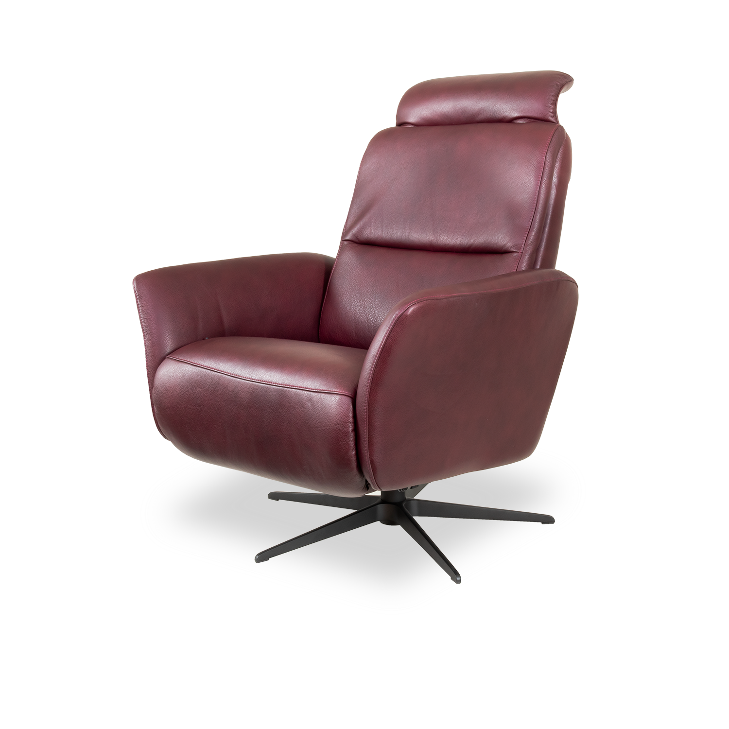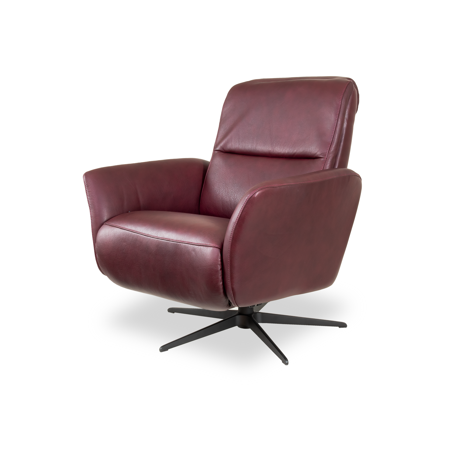 [0] => The Brighton Manual Recliner features classic elements of Danish design with a dynamic twist - a manual motion reclining mechanism and the ability to transform from a living room swivel chair to a full-body recliner. With Ox burgundy leather and a minimalist black base, this chair has a tailored, clean look. A sleek handle located within the right armrest allows you to adjust the leg and backrests to your level of comfort, while the concealed headrest can be easily lifted for full neck and head support. Made in Europe.